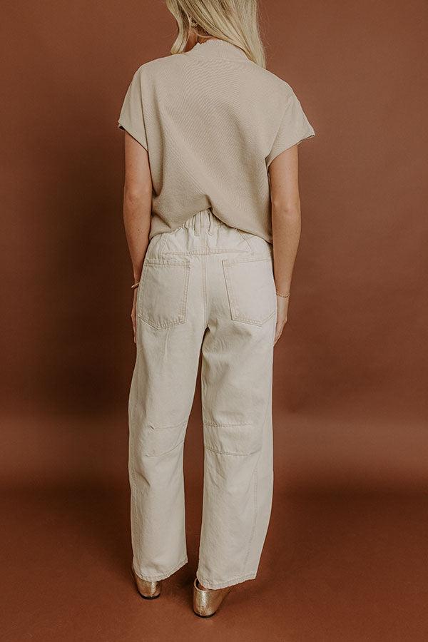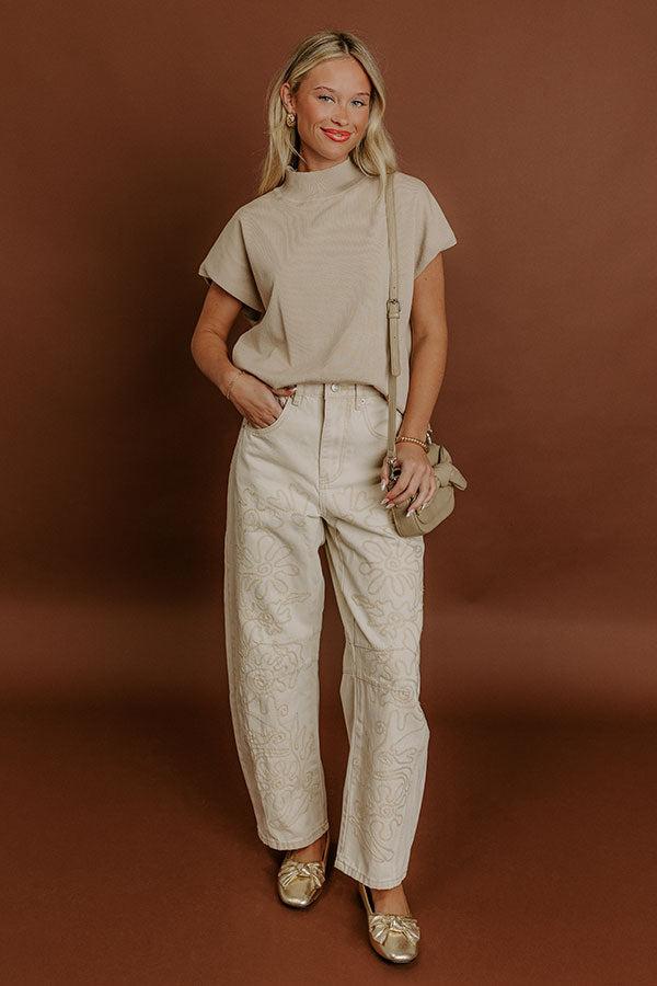 - Bring a playful pop of style to your OOTD with these trendy barrel leg jeans! Their floral embroidery adds the cutest detail to any outfit. - Unlined denim material - A cream colored floral design embroidered on the front - A waistline with an elastic back - Belt loops - A hidden zip fly and button closure - Functional front and back pockets - A barrel leg silhouette that ends in straight hemlines