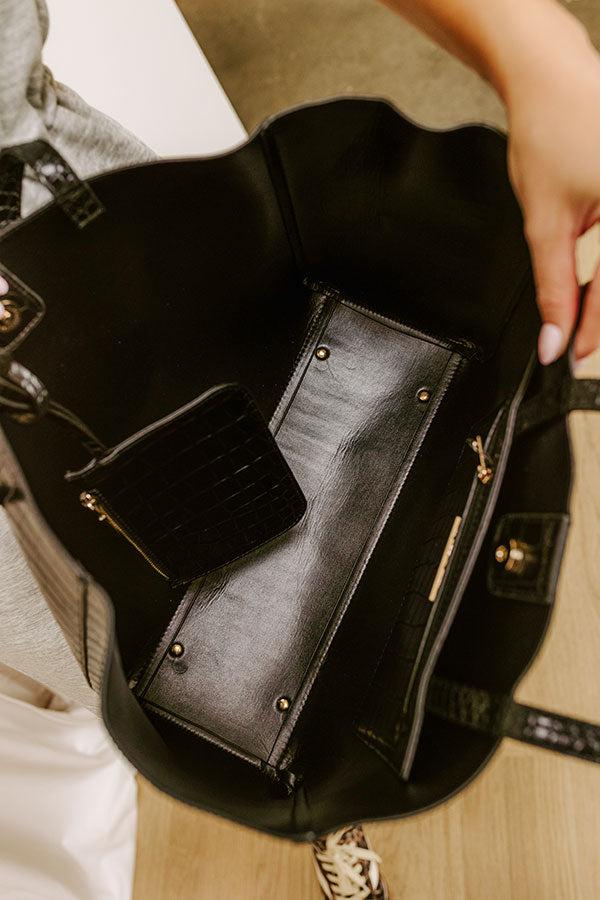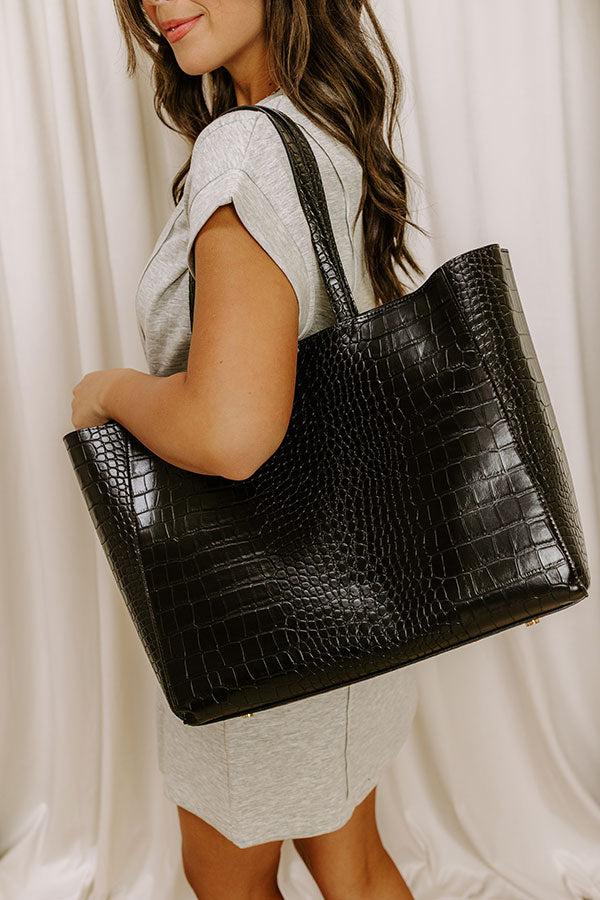- From city strolls to weekend getaways, this chic tote is ready for it all! Its trendy design with two matching pouches keeps your look stylish and organized. - Textured faux leather material - Gold toned metal hardware - Two handles on top - A spacious, unlined interior - A separate petite zippered pouch that attaches onto a handle - An attached pouch with zip closure