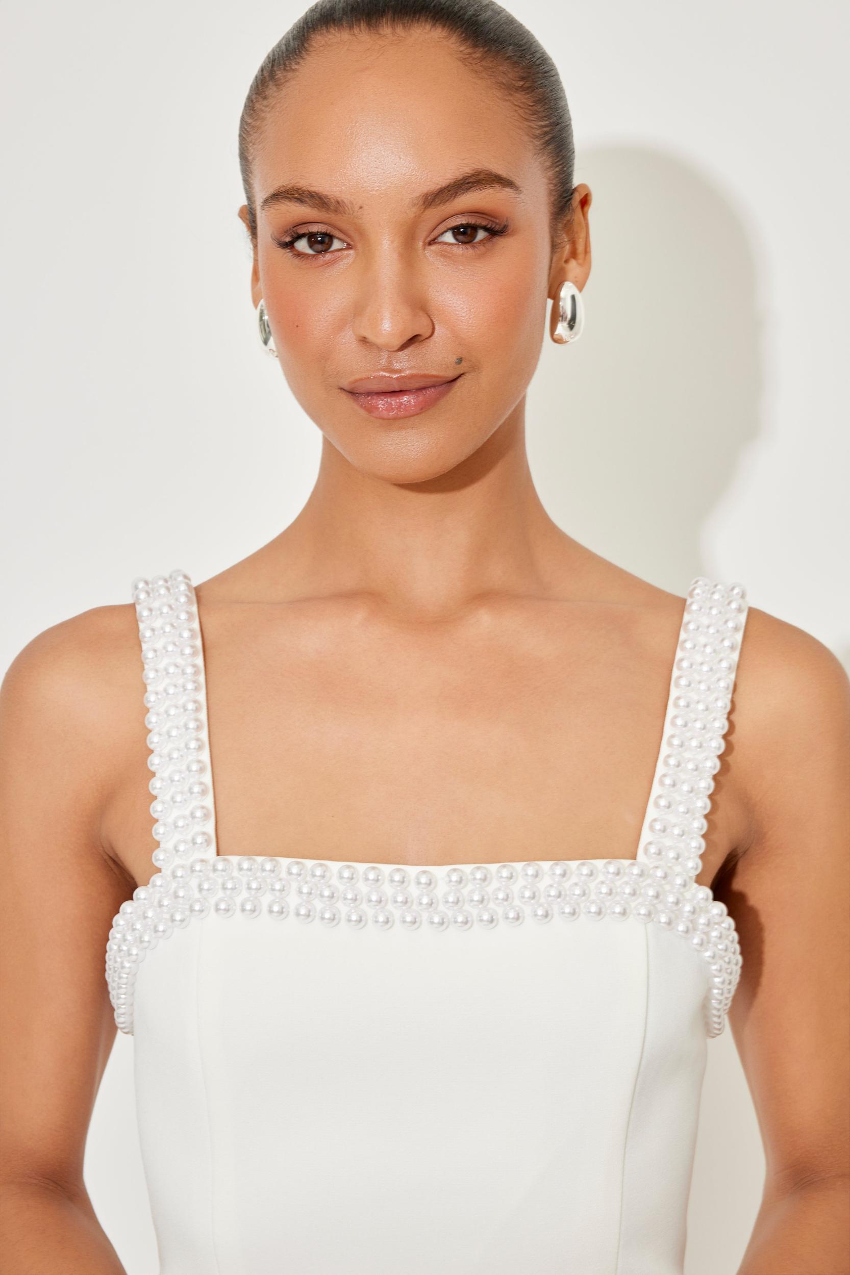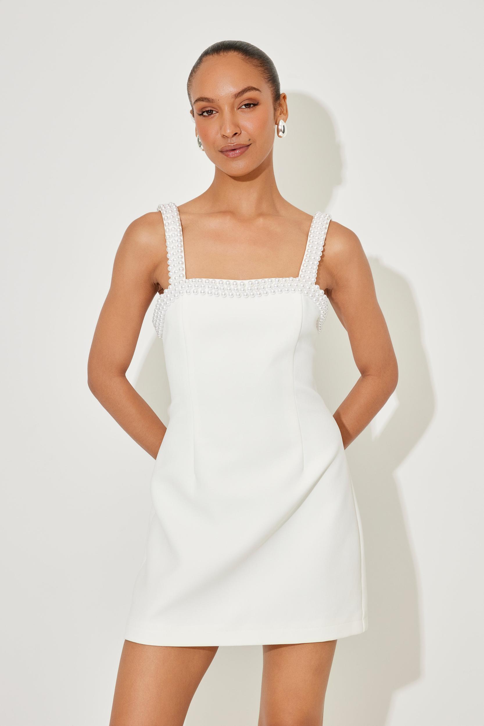 Did you think we would forget our iconic pearls? A statement for your special day and remaining a forever wardrobe staple, this piece is the epitome of breathtaking bridal wear. Cut from our long-adored signature fabric, the evolution of the pearls continues. Embracing elegance and femininity with a touch of opulence across the pearl embellishment neckline, this crisp white mini is our special iteration for our brides-to-be.