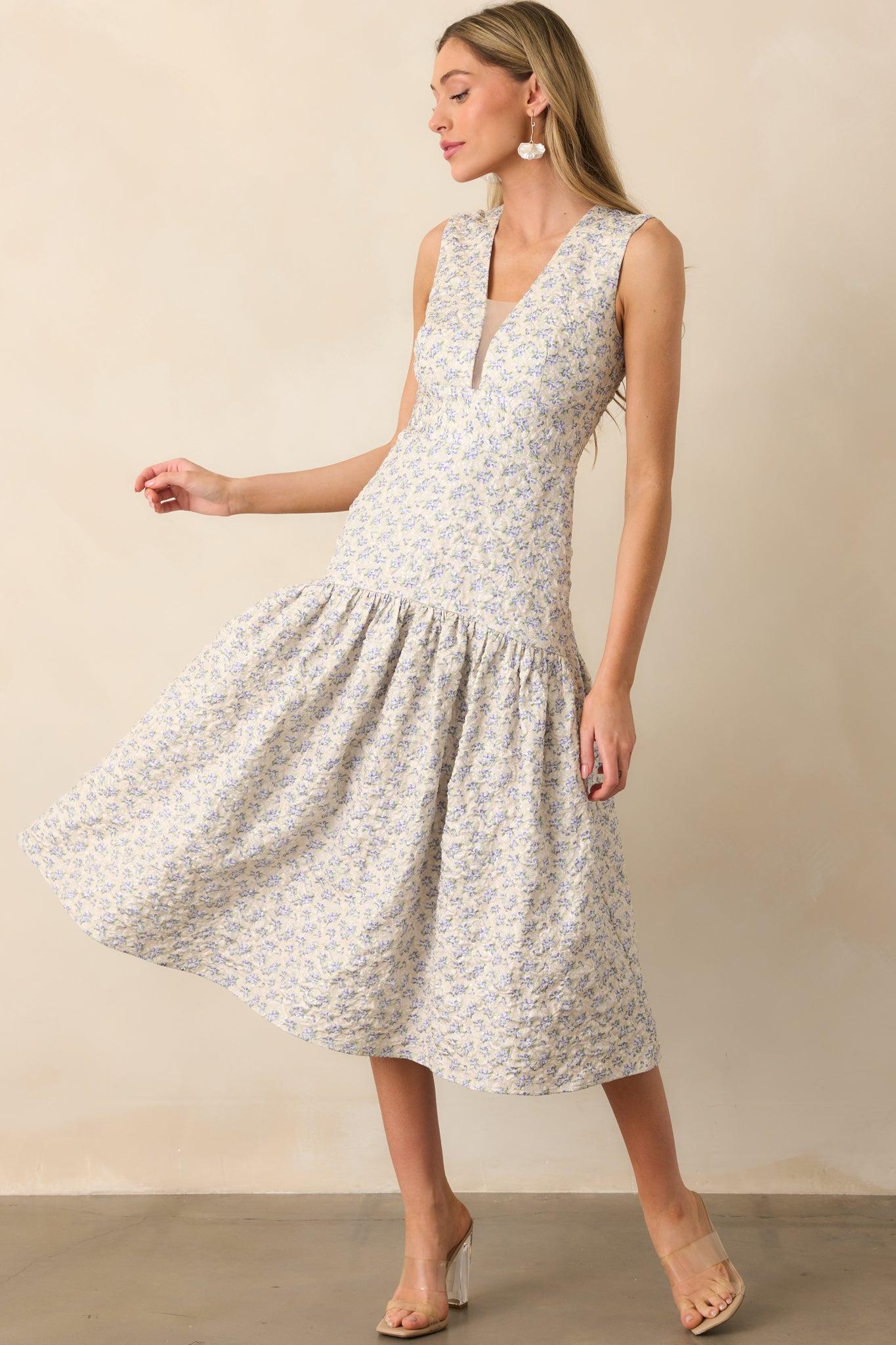 The Unexpected Periwinkle Floral Jacquard Midi Dress brings a refreshing twist to your wardrobe with its vibrant floral pattern and luxurious jacquard fabric, making it perfect for any occasion that calls for effortless elegance. This midi dress features a periwinkle floral print, jacquard fabric, subtle clear sequin details, a deep v-neckline with a mesh panel, sleeveless, drop waist design, and a hidden back zipper. 100% Polyester Lining: 95% Polyester & 5% Spandex Hand Wash Cold Manufactured in China Designed in the USA Model is 5'8" and wearing size x-small