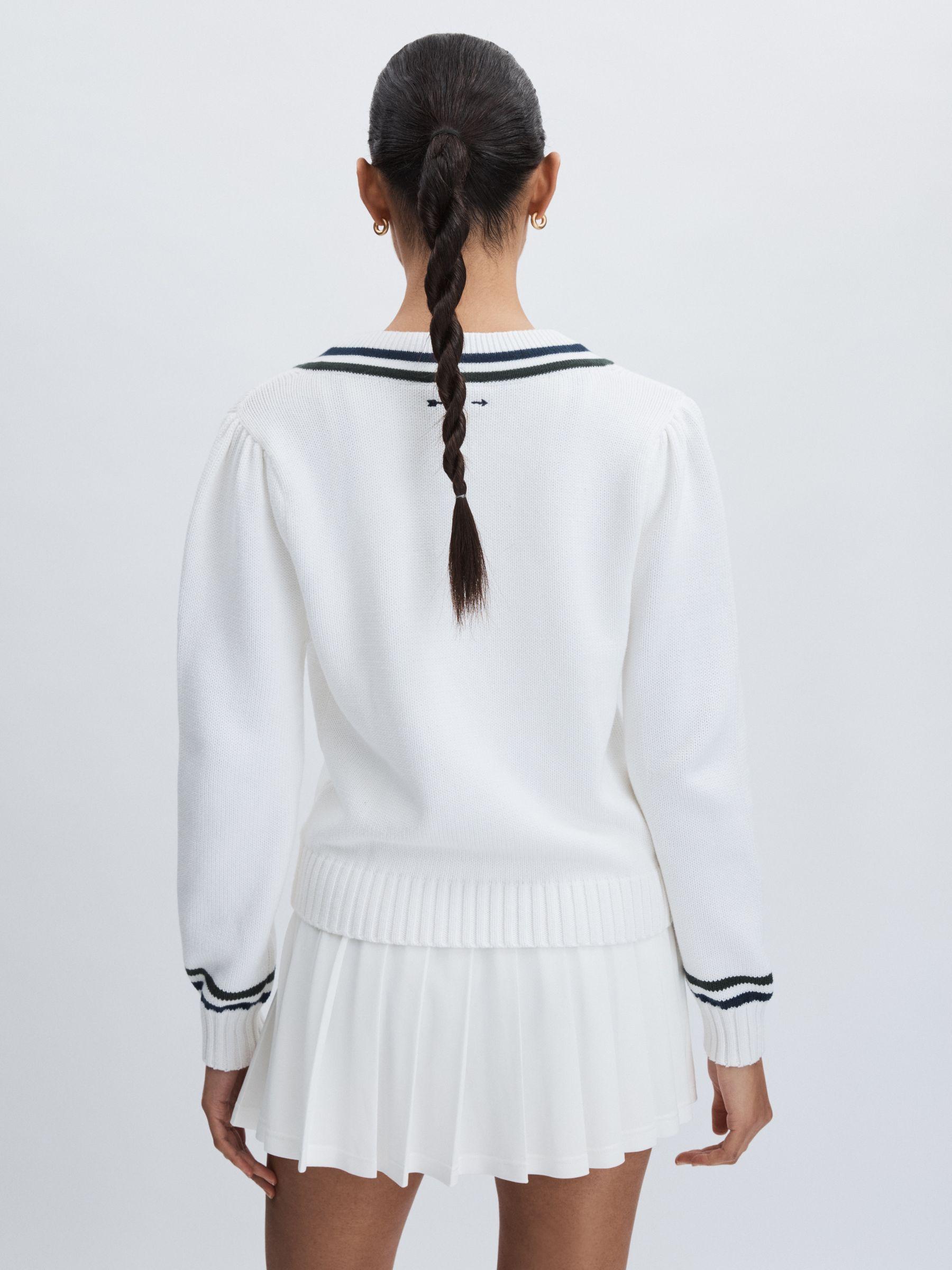 Inspired by classic tennis styles, the Sonny jumper’s sporty look is enhanced by knitted stripes at the neckline and sleeves. The slouchy silhouette and deep V-Neckline encourage layering. 100% organic cotton, knitted stripes at neckline and sleeves, deep V-Neckline, embroidered logo to reverse, ribbed trims. Introducing Reiss x The Upside, our exclusive collection of women’s athleisurewear combining The Upside’s sporting expertise with our unwavering eye for style.