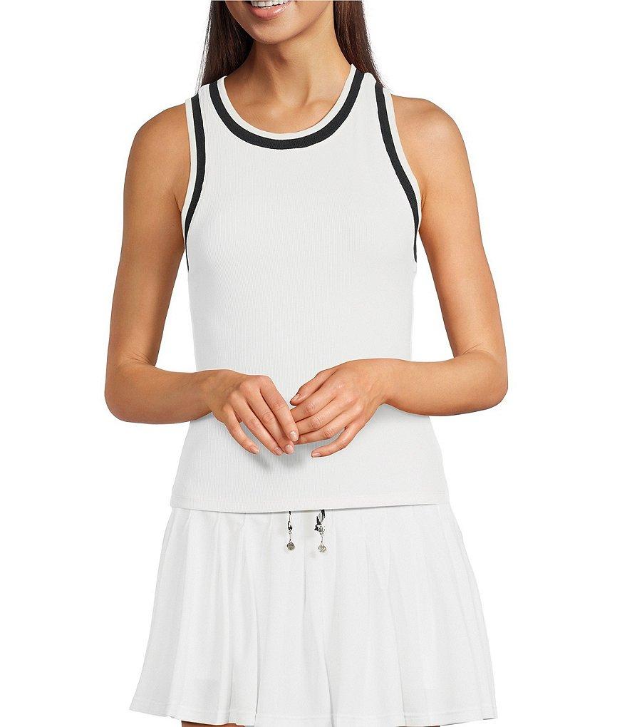 From The Upside, this top features: Rib fabrication Crew neckline Sleeveless Pullover construction Printed arrow logo at back neck Moisture wicking properties Striped rib neckband and armhole detail Approx. 20" length Recycled polyamide/elastane Machine wash/dry flat Imported.