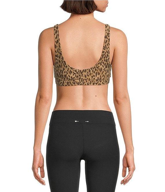 From The Upside, this bra features: Recycled soft peached with a brushed hand feel Leopard print Mid coverage bra Scoop front & back neck Pullover construction Tonal arrow logo on back Removable bust cups Moisture wicking Breathable, quick drying and extra soft Polyamide/elastane Machine wash/hang dry Imported.