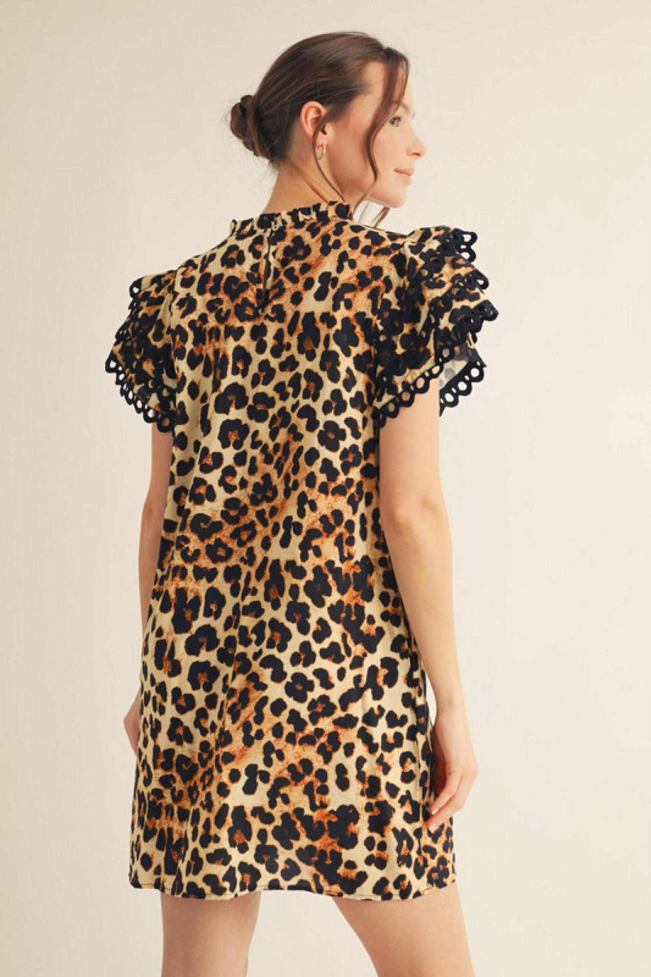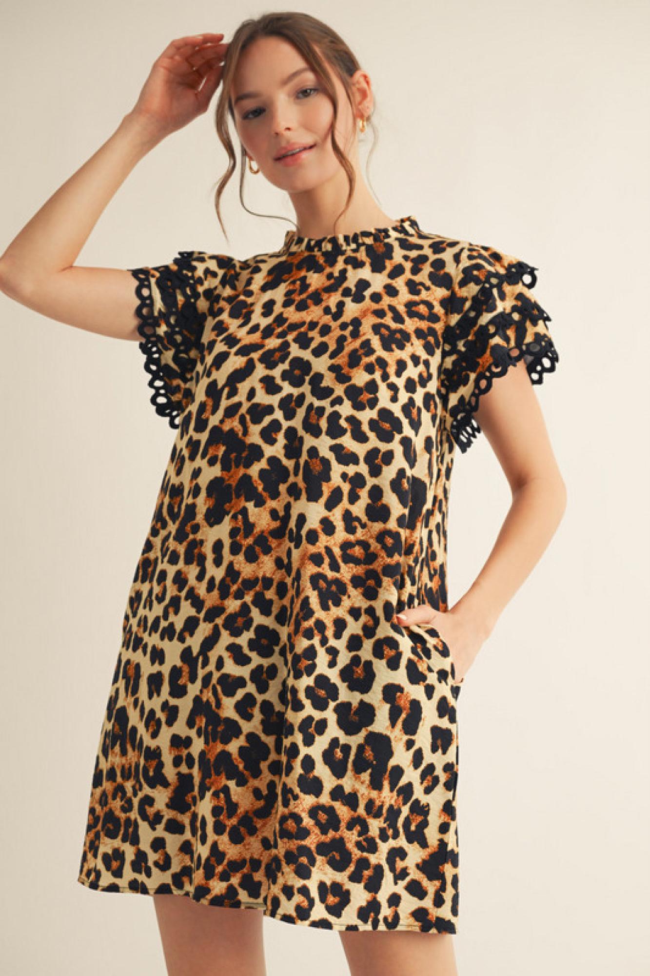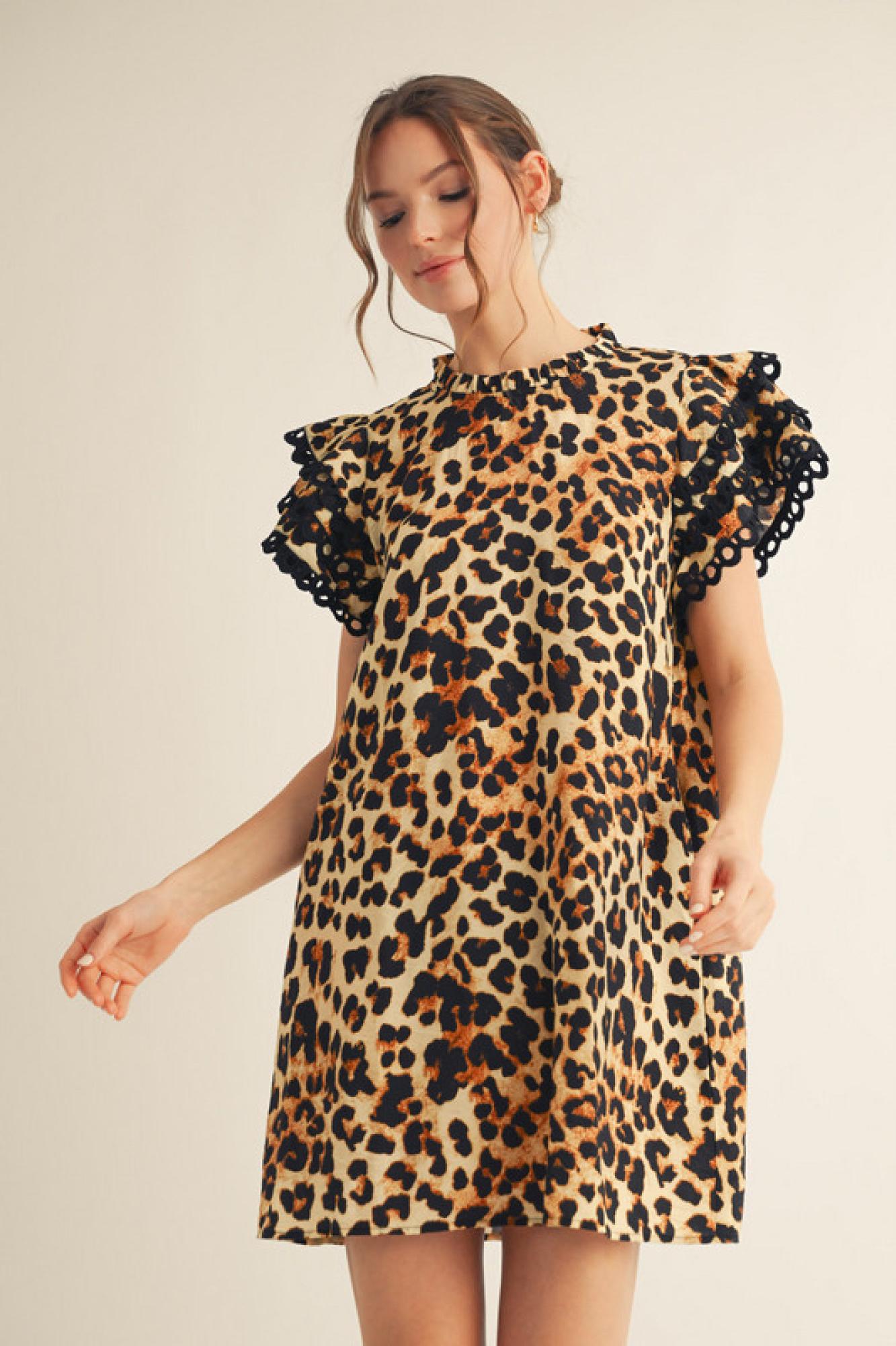 Unleash your wild side with the Leopard Print Dress, a perfect blend of boldness and elegance. Designed with a frilled neckline and layered ruffly cap sleeves, this dress adds a touch of femininity while maintaining a chic, statement look. The eyelet trimming inserts on the sleeves and hem bring delicate detailing, while the back keyhole closure offers a stylish finish. Crafted from a lightweight, non-sheer fabric, this dress ensures comfort without compromising on style. Plus, the side pockets add a practical touch to this effortlessly fashionable piece.