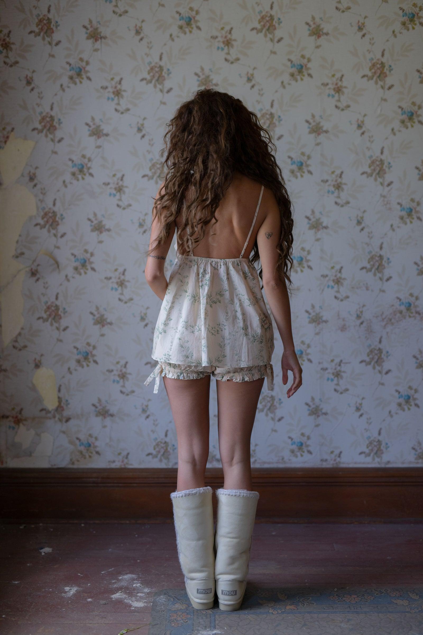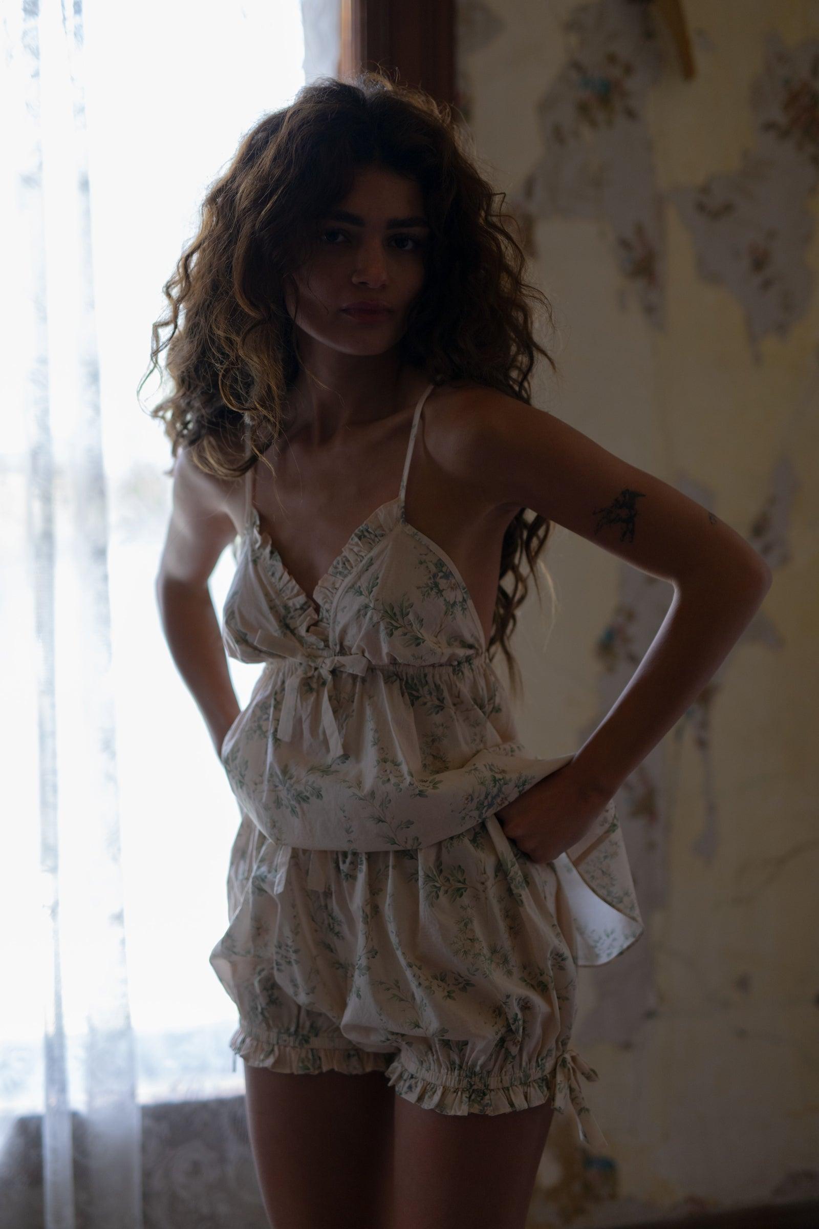 Curl up with a treasured collection of zen poetry, savoring each lyrical verse in this vintage-inspired two-piece sleep set, which includes a cute babydoll top and a pair of bloomers. A center bow and ruffle detail enhance the top, and twin bows on the bloomers skim your upper thighs. The bloomers feature a tie at the waist with comfortable elastic around the legs and waist so you can fall asleep and have sweet dreams. Crafted entirely from cotton, this set will feel soft and cool on the skin. Two-piece cotton pull-on sleep set Babydoll top with soft ruffle detail and underbust tie Bloomers with tie at waist and bow details at hem Comfortable elastic at waist and leg To ensure the best fit, measure your across bust and high waist before ordering and steam for optimal beauty. Vie is 5’8” and wearing a size XXS in Selkie. Her measurements are 31” bust, 23” waist, 36” hip. Fabric: 100% Paper Cotton