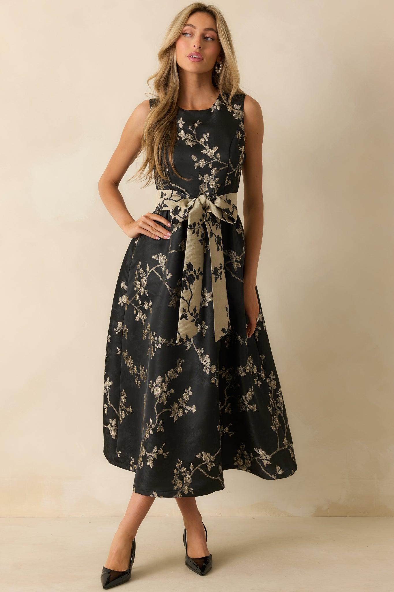 Graceful and grounded, The Way She Blooms Black Floral Jacquard Bow Belt Maxi Dress captures timeless sophistication with every detail — from its luxe black jacquard to the metallic floral design and sweeping bow belt. A perfect harmony of elegance and ease, it’s made for moments that feel effortlessly refined. This black floral jacquard maxi dress features a sleeveless bodice with a round neckline, an open keyhole back, functional pockets, a removable metallic tie belt, and is designed with a concealed back zipper, full lining, and structured woven fabric for a polished, feminine silhouette. 100% Polyester Lining: 100% Polyester Hand Wash Cold Manufactured in China Designed in the USA Model is 5'8" and wearing size small, clipped, model is a true x-small.