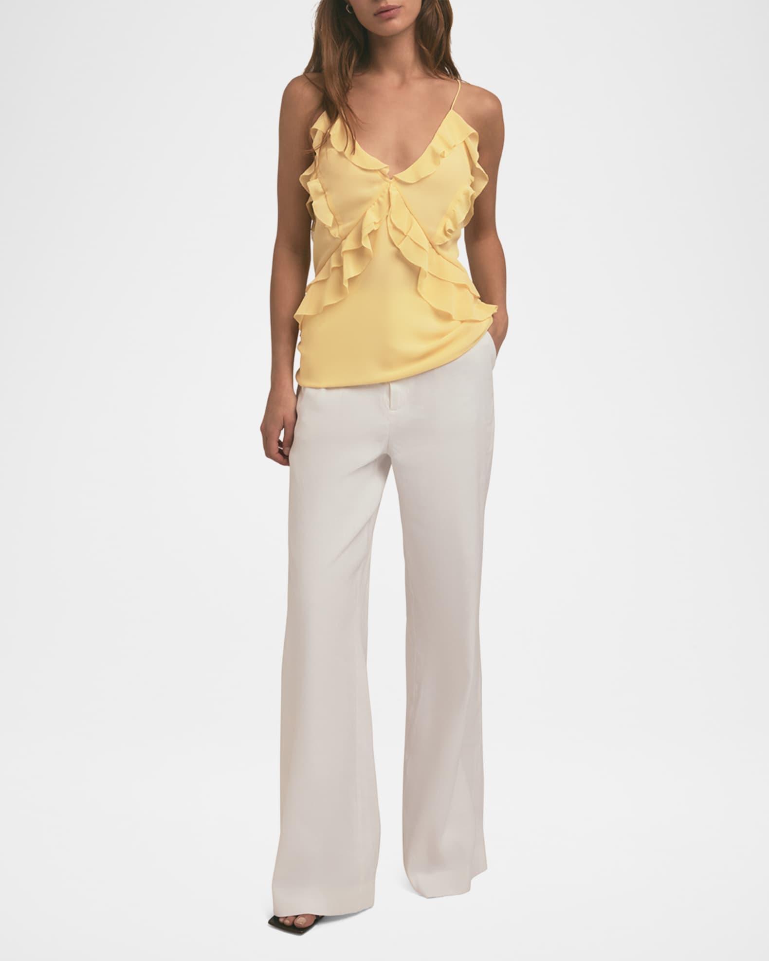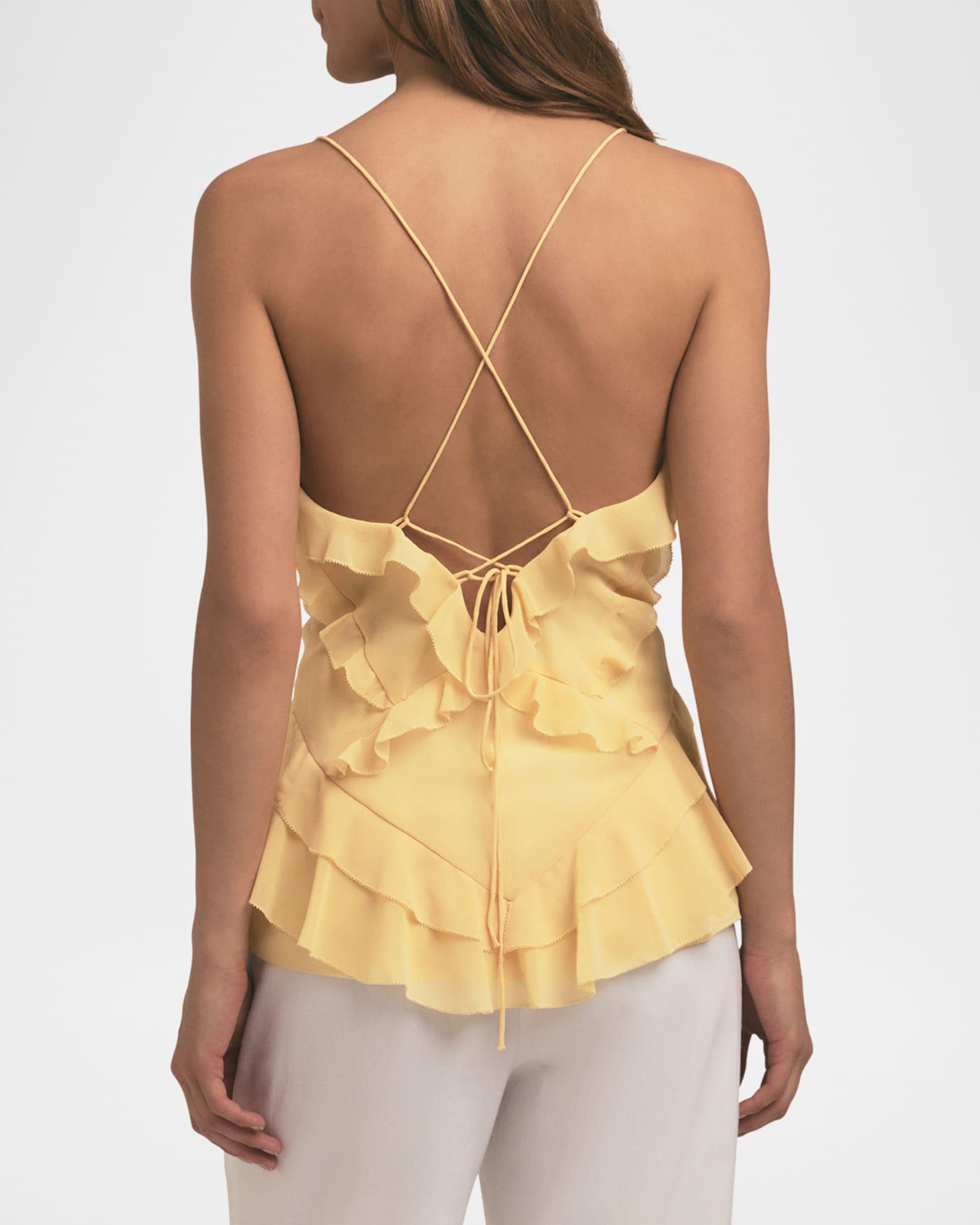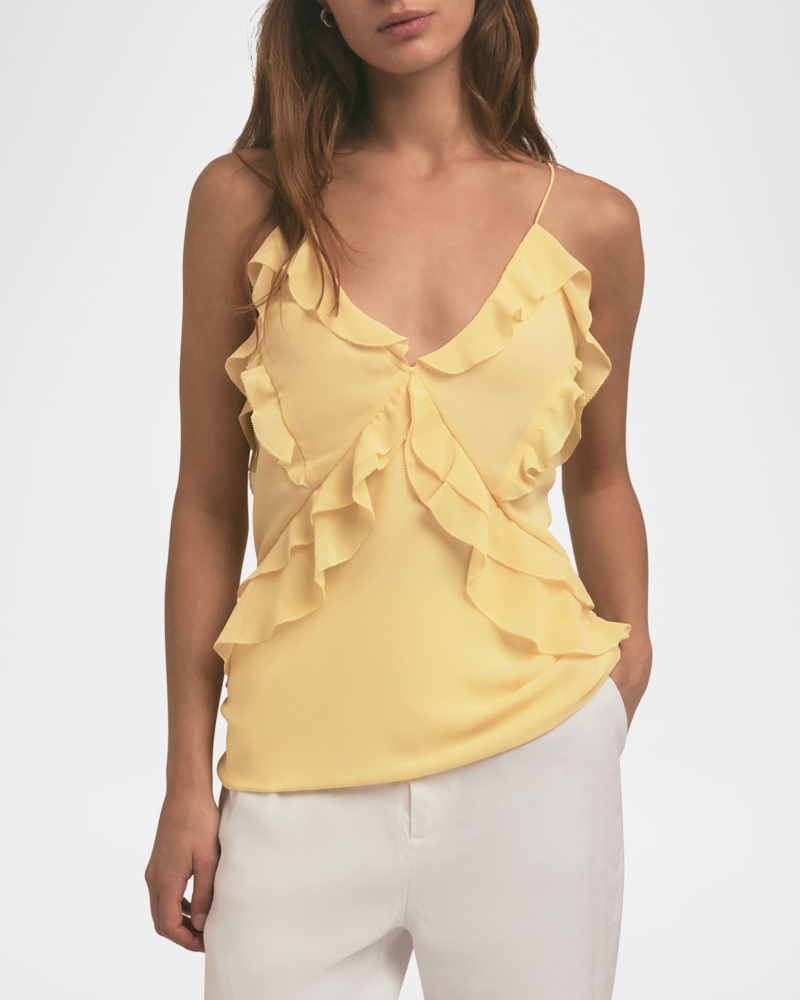 Favorite Daughter "The Who Me" blouse with cascading ruffle trim V neckline Sleeveless Hip length Relaxed fit Mid-back self-ties Polyester Imported