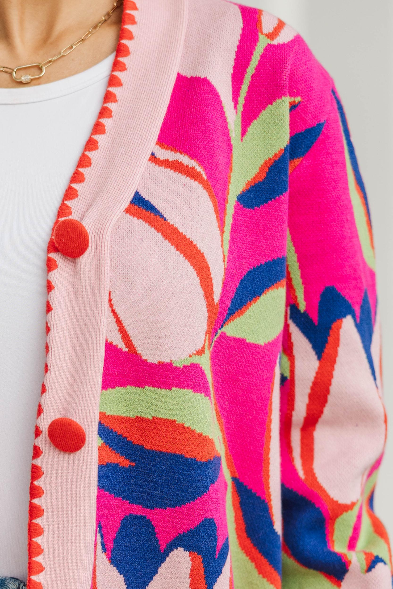 This statement cardigan brings instant joy to your outfit with its bold floral print and playful contrast trim. Soft, cozy, and easy to layer, it’s the perfect piece for adding a pop of color while still feeling polished. Style it over a simple tee with denim for a look that’s effortlessly chic and fun. Open front neckline Long sleeves Button-front closure Straight hemline Soft fabric with moderate stretch Baileigh is wearing the small.