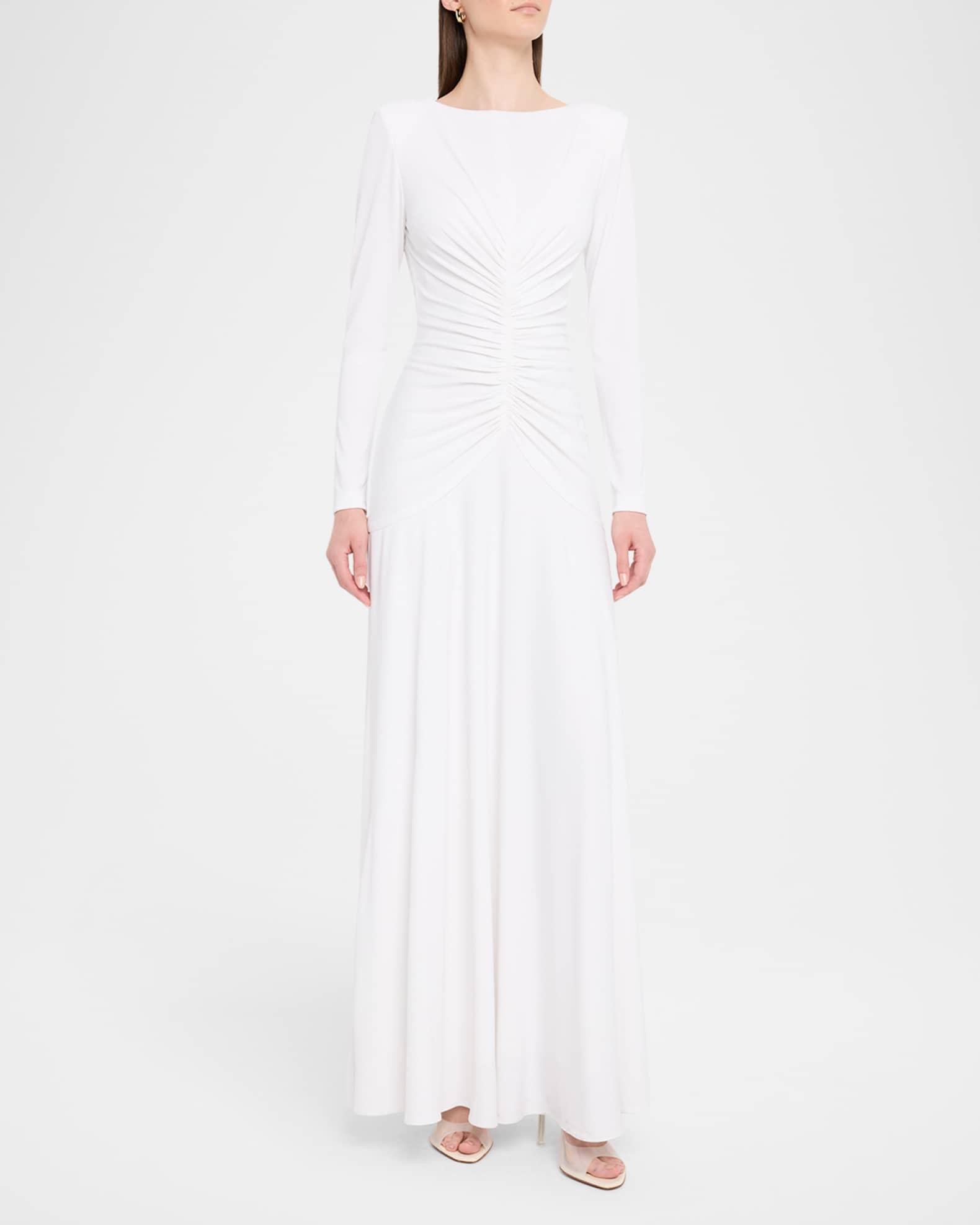 Fluid and elegant, the Et Ochs "Thea" gown features front and back ruching for an elevated silhouette Approx. 63"L from shoulders to hem High neckline Padded shoulders Long sleeves Full length A-line silhouette Invisible back zipper Polyester/spandex Dry clean Imported