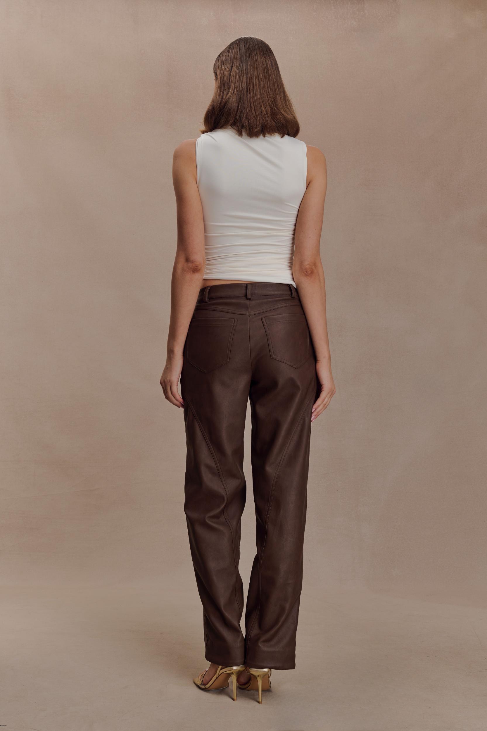 Modern edge, tailored polish. The THEO Faux Leather Mid Rise Pants bring a sleek, contemporary feel to a timeless straight-leg silhouette. Designed with a mid-rise waistline, they feature a front fly opening secured with a custom button, plus belt loops for added versatility. Side and back pockets deliver clean functionality, while full lining ensures a smooth, comfortable fit against the skin. Cut to a full-length finish, these pants balance structure and attitude — a refined staple for day-to-night dressing.