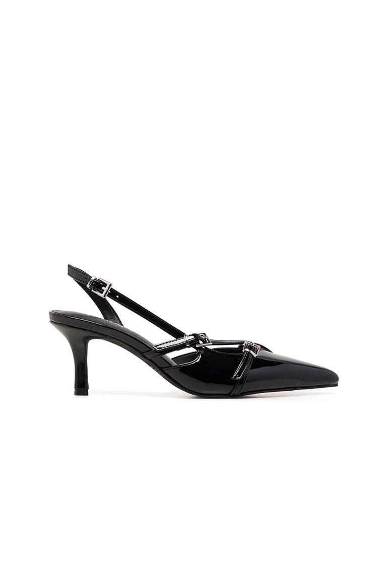 Juicy Black Patent Slingback Heels by TherapyHow to style:Elevate any look with the Juicy Slingback Heels by Therapy. Whether its walking into the office or on a night out, these shoes add a touch of elegance and sophistication to your outfit. Pair with gold jewellery for a completed outfit.Features: Slingback Pump Design Closed Pointed Toe Kitten Heel Round Topline Heel Strap with Adjustable Buckle Fastening Thin Crossover Upper Straps with Buckle Detail