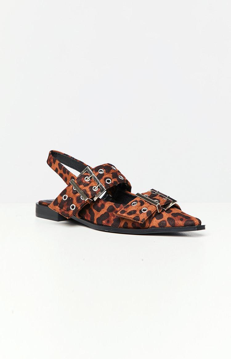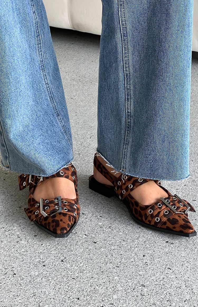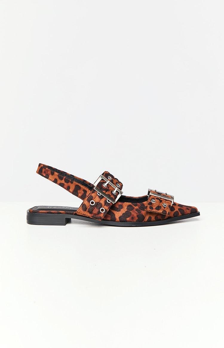 Matilda Leopard Print Pointed Flats by TherapyHow to style:Add a fierce touch to your outfit with our Matilda leopard print pointed flats. Perfect for both casual and dressy occasions, pair them with black pants and a cozy sweater for a chic day look. For an elevated evening ensemble, style them with black dress and a statement red bag.Features: Slingback flat design Closed pointed toe Low block heel Quilted upper straps with adjustable buckle fastening Eyelet detailing Leopard print