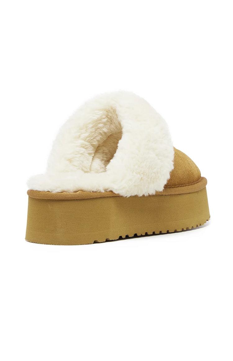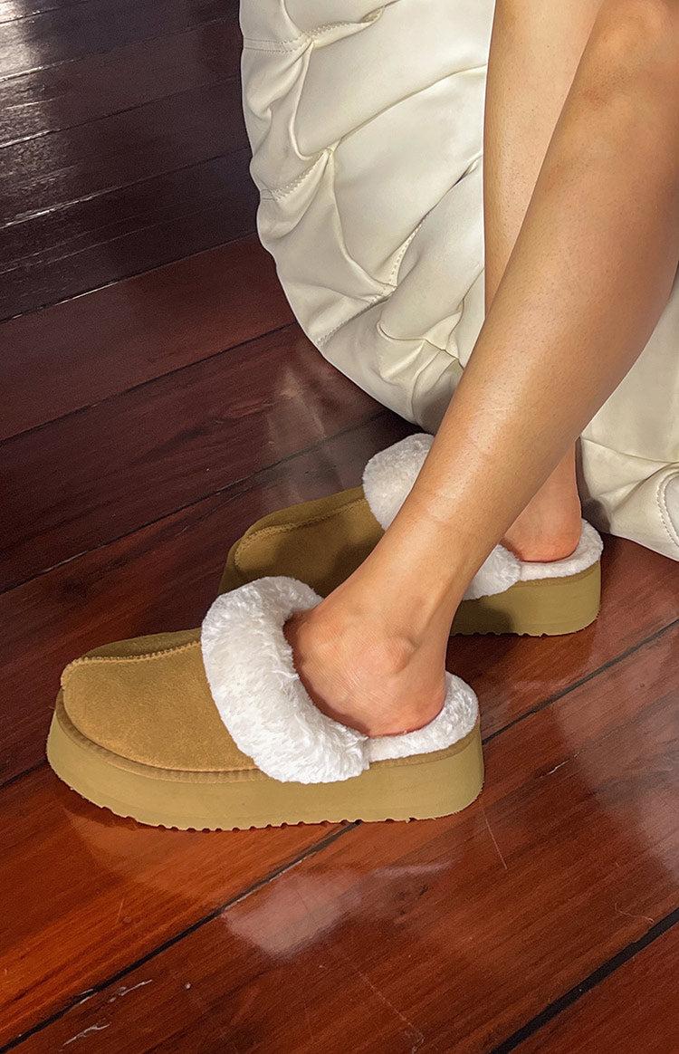 Therapy Ziggy Tan Suede Cow SlippersHow to Style:Step into comfort with these gorgeous Therapy Slippers. Add a pop of colour to any casual fit! Style with a pair of jeans and a comfy sweater for that relaxed feel!Features: Cow Suede Leather Upper Soft Synthetic Fur Lining Open Back Slide On Scuff Closed Toe Design Platform Sole