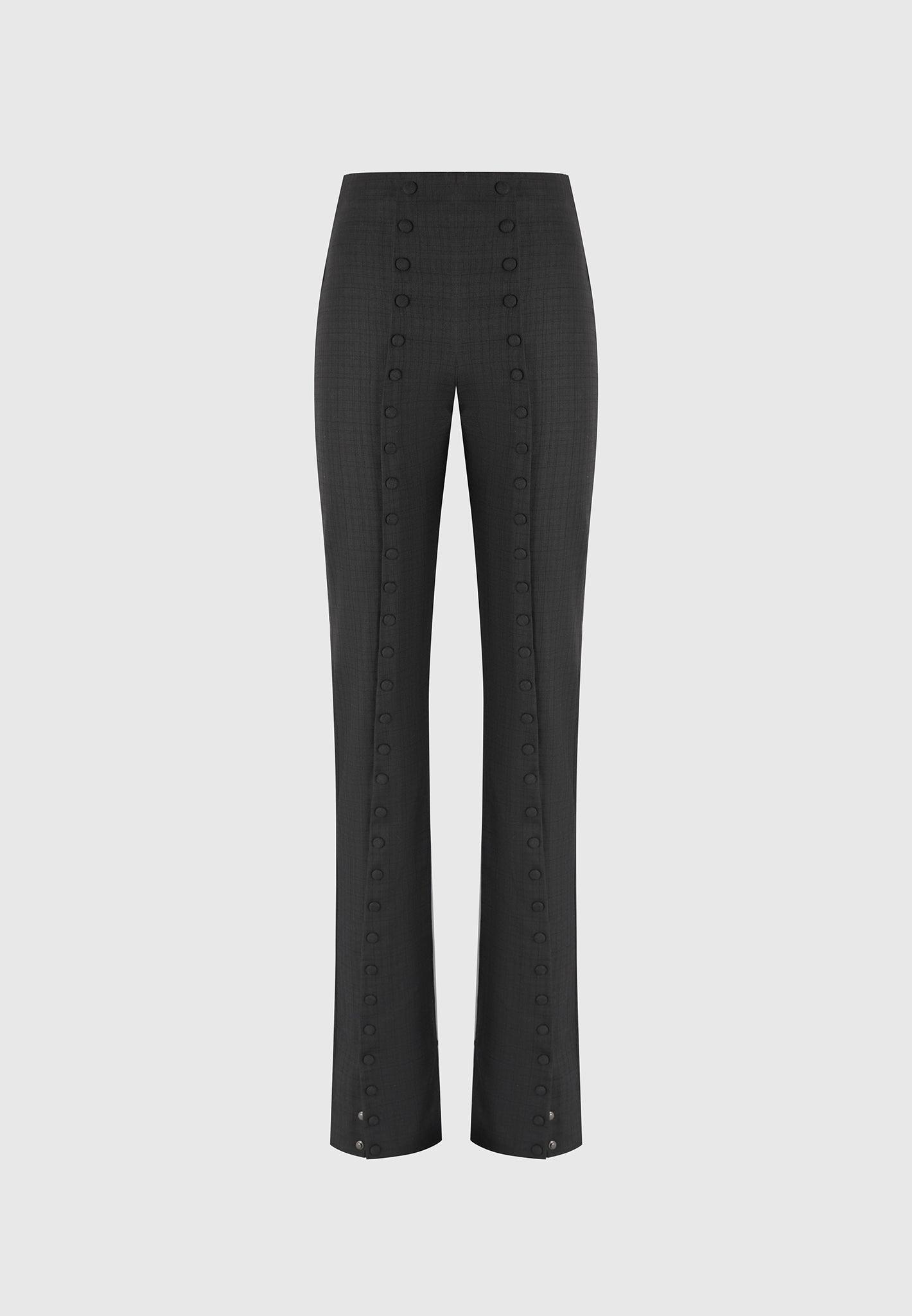 Elevated with statement detailing, these tailored trousers reimagine classic suiting through a contemporary lens. Designed in a sleek, slim-leg silhouette, the high-waisted style features dual columns of tonal buttons running from waist to hem for a bold, elongating effect. Back welt pockets and subtle darts shape the fit, while the structured suiting fabric provides clean lines with a touch of stretch for comfort. High-rise tailored fit with an elongating, flared leg Double button-front detail from waist to hem for statement structure Welt pockets at the back for a polished finish Darted construction for a contoured silhouette Constructed from high-quality tailoring fabric for a luxurious finish Silver Manière De Voir plaque on the reverse serves as a signature accent 75% Polyester, 25% RayonAlways check the care label for wash instructions.