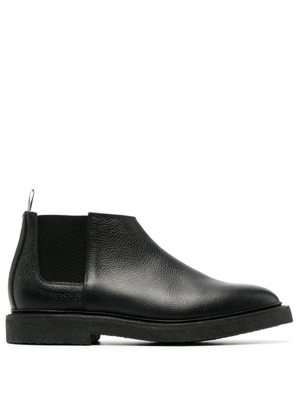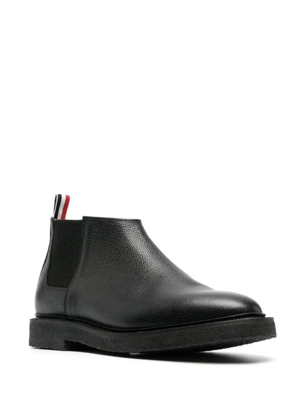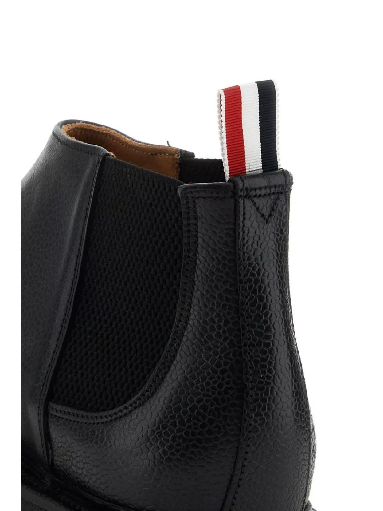 Shop Thom Browne Leather Mid-top Chelsea Boots In Black from 800+ stores, starting at $369. Mid-top chelsea ankle boots by Thom Browne made of grained leather with elastic side bands, tricolor grosgrain loop tab, leather interior and crepe rubber sole.. Colours. : Black. Composition. : Leather. Made in. : United Kingdom. MPN. : MFB224B06257. .