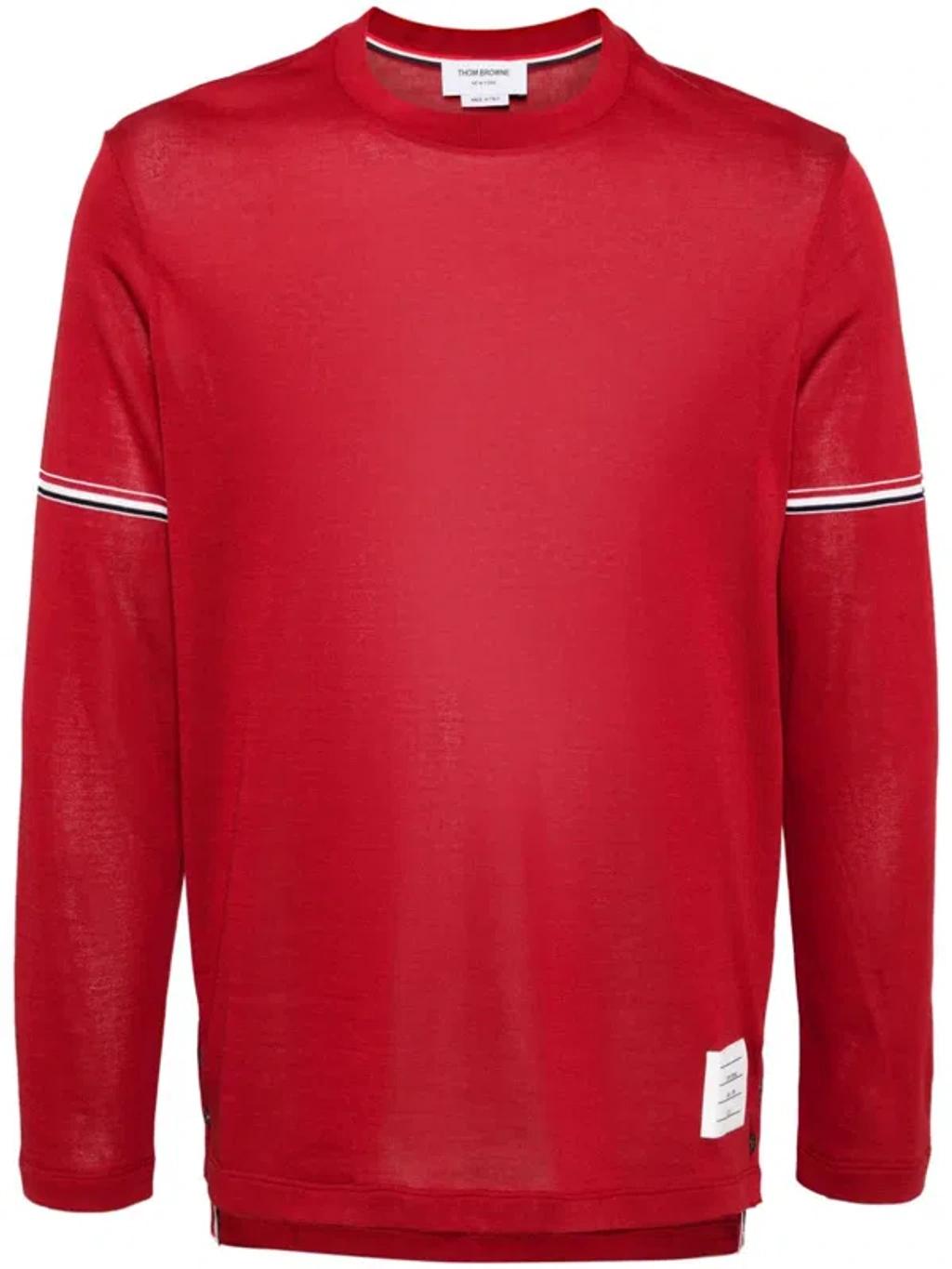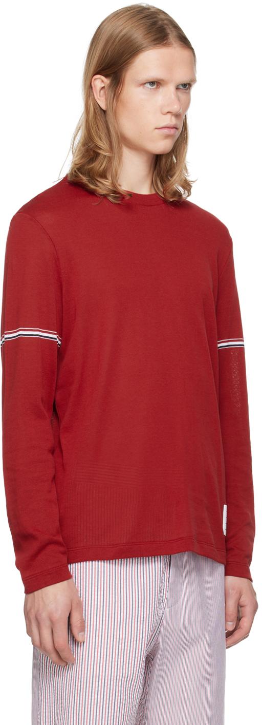 Shop Thom Browne Red Stripe Long Sleeve T-shirt In 615 Burgundy from 800+ stores, starting at $435. burgundy red cotton knitted construction crew neck long sleeves RWB stripe logo patch to the front button-fastening side slits signature grosgrain loop tab high-low hem