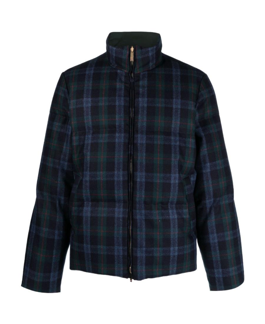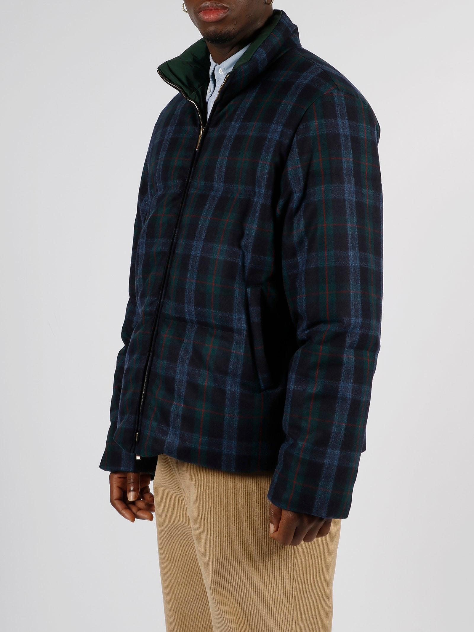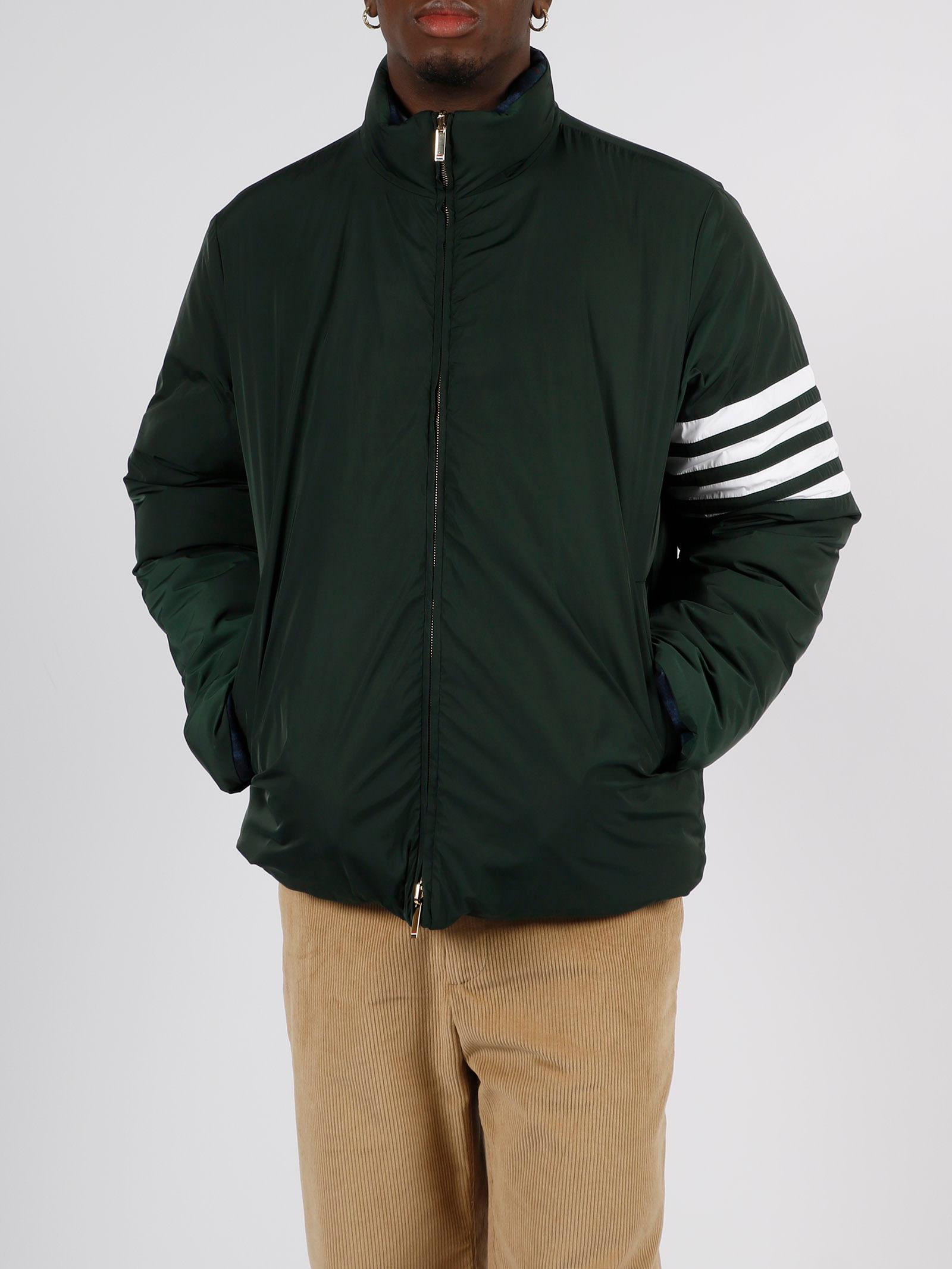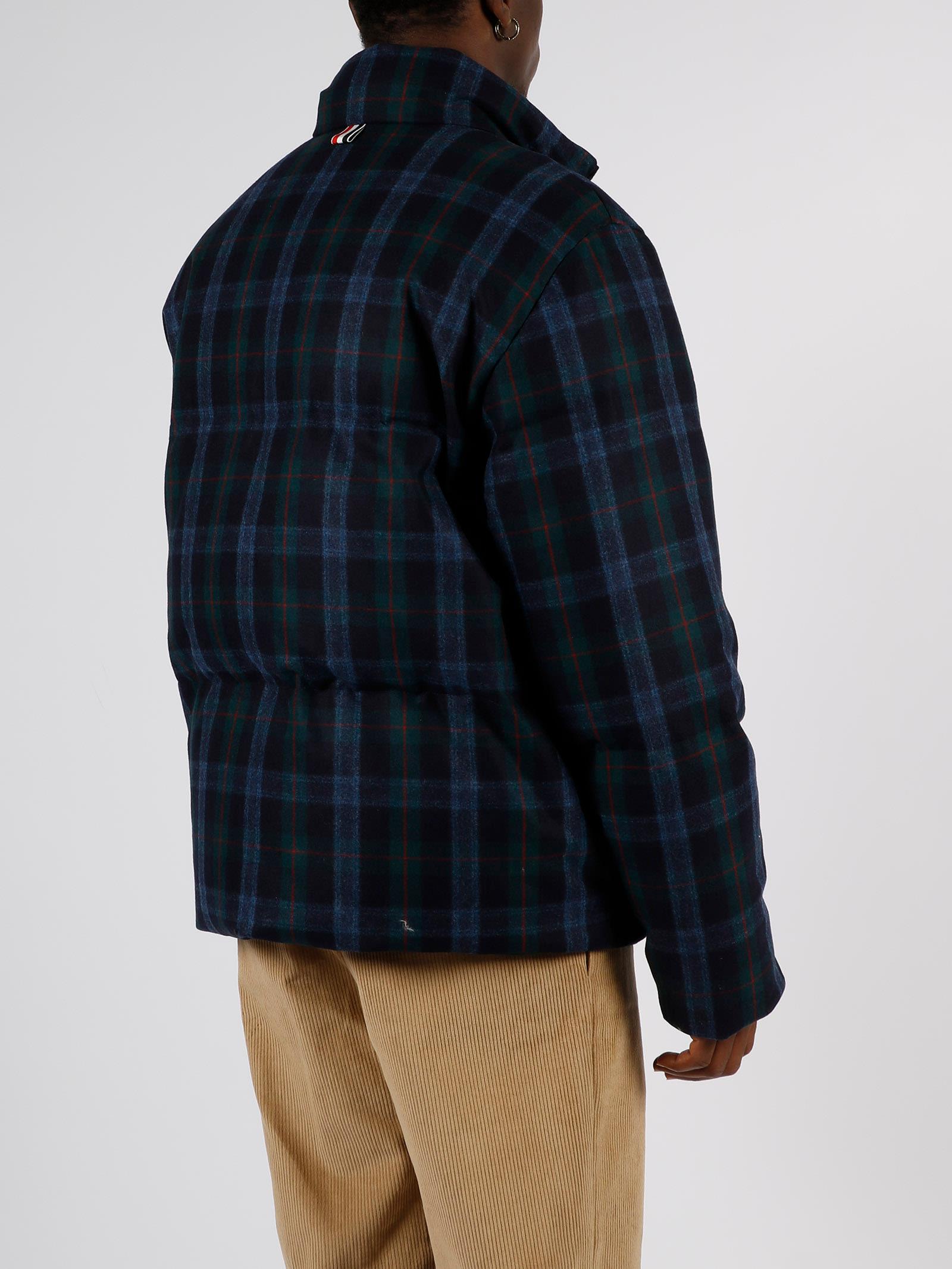 Shop Thom Browne Wool Blend Check Reversible Puffer Jacket In Multi from 800+ stores, starting at $1915. This stylish reversible funnel neck jacket features a blue tartan pattern on one side and green nylon on the other, both with distinctive designs. The green nylon side is accented with a 4-bar stripe detail in white on the left sleeve, adding a sporty touch. The jacket includes a 2-way brass zip closure and convenient slip side pockets on both sides, providing practicality and ease of use. A signature striped grosgrain loop tab is located at the back of the neck, adding a unique and recognizable detail to this versatile piece.95% Wool, 5% Cashmere Combo 1: 100% Polyester Padding: 80% White Goose Down, 20% White Goose Feathers Made in Italy.