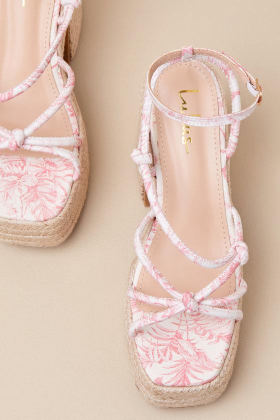 With the Lulus Thomasin Pink Tropical Print Platform High Heel Sandals, you'll be eager to book a ticket somewhere warm and beachside! These resort-ready platform sandals feature a tropical-inspired print that sweeps across a square footbed, the strappy knotted vamp, and an adjustable ankle strap (with a shiny gold buckle). A raffia-wrapped sole and heel complete the summery design.