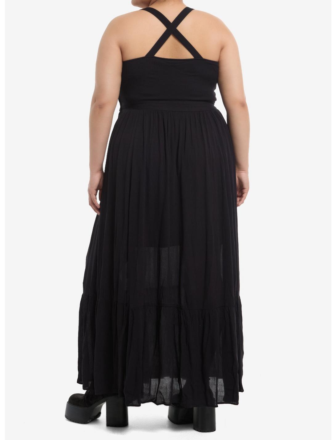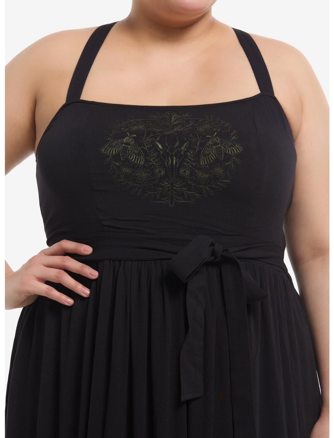 Enter your dark fairytale era with this black maxi dress! Featuring green embroideries on the bust of a raven skull, moths and foliage. Comes with a tiered crinkle skirt and wrap ties around the waist. Designed with pockets and crisscross straps on the back.Please note: Style is fitted with no stretch; size up for a looser fit.100% rayon crinkle gauzeWash cold; dry flowNon-stretch materialLength: 51''ImportedModel is 5'10''Model wears size 1