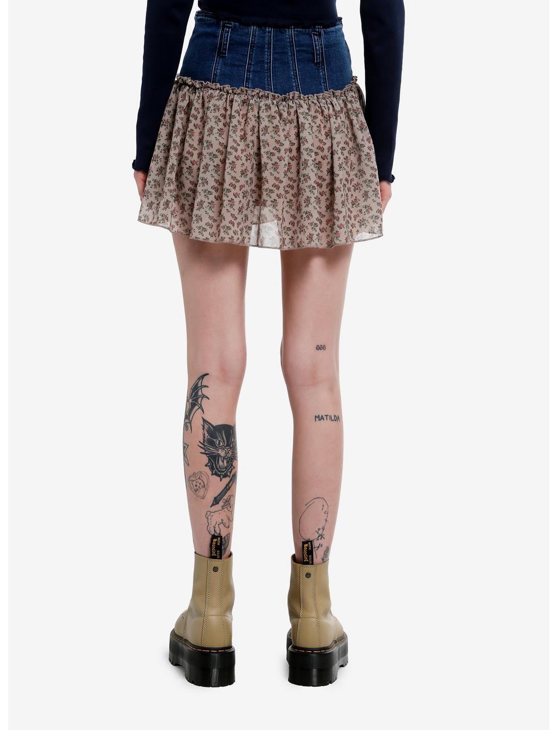 Make sure your look blossoms with this adorable denim & floral skirt! Featuring a dark denim upper with seams down the back and front, plus 4 buttons at the center, plus an angled layer of floral fabric underneath.98% cotton; 2% spandexWash cold; dry lowLength: 15"Stretchy materialImportedListed in junior sizesModel is 5'10"Model wears size Small