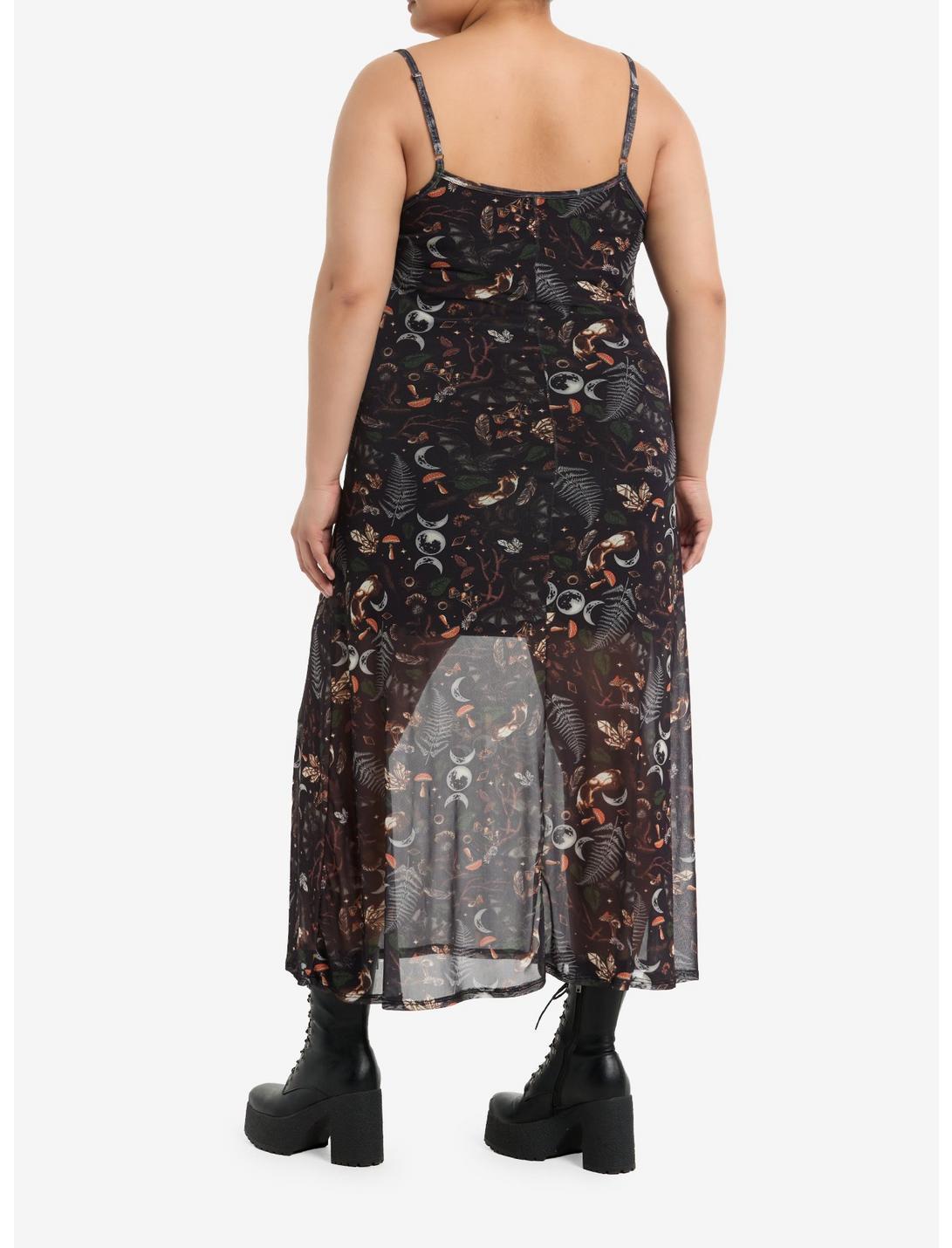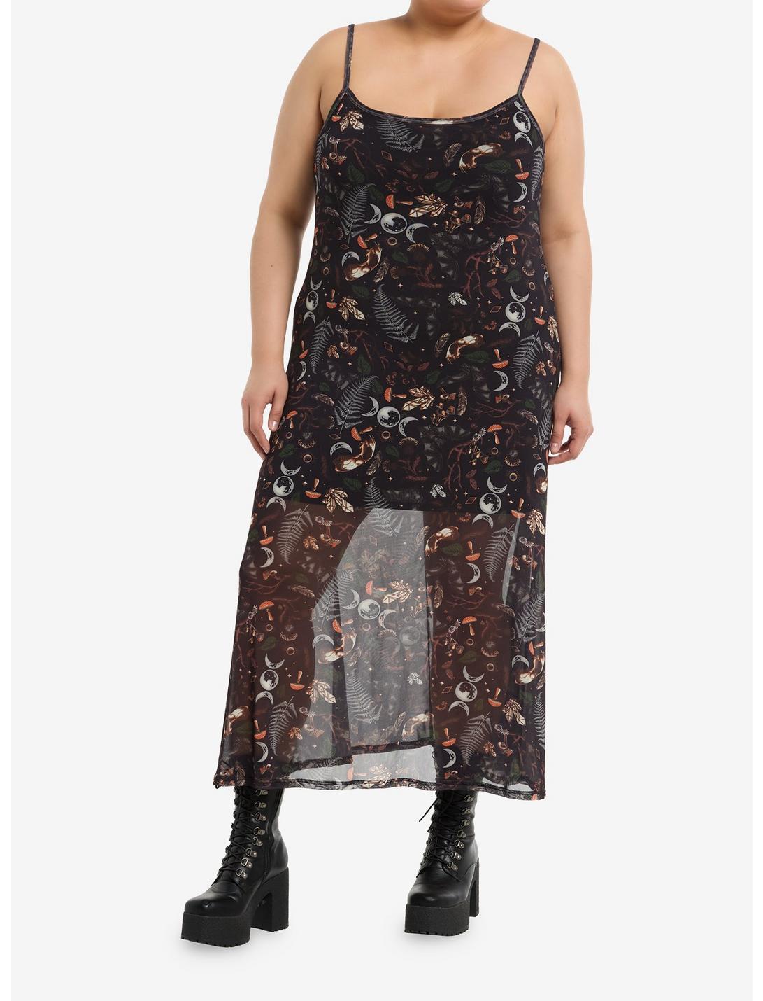 This cami maxi dress has a mesh overlay printed with a haunting print of animal skulls, moons, ferns, crystals, mushrooms and dead flowers. It has a black mini dress liner for a semi-sheer look and has adjustable straps.92% polyester; 8% spandexWash cold; dry lowLength: 48"ImportedModel is 5'10"Model wears size 1