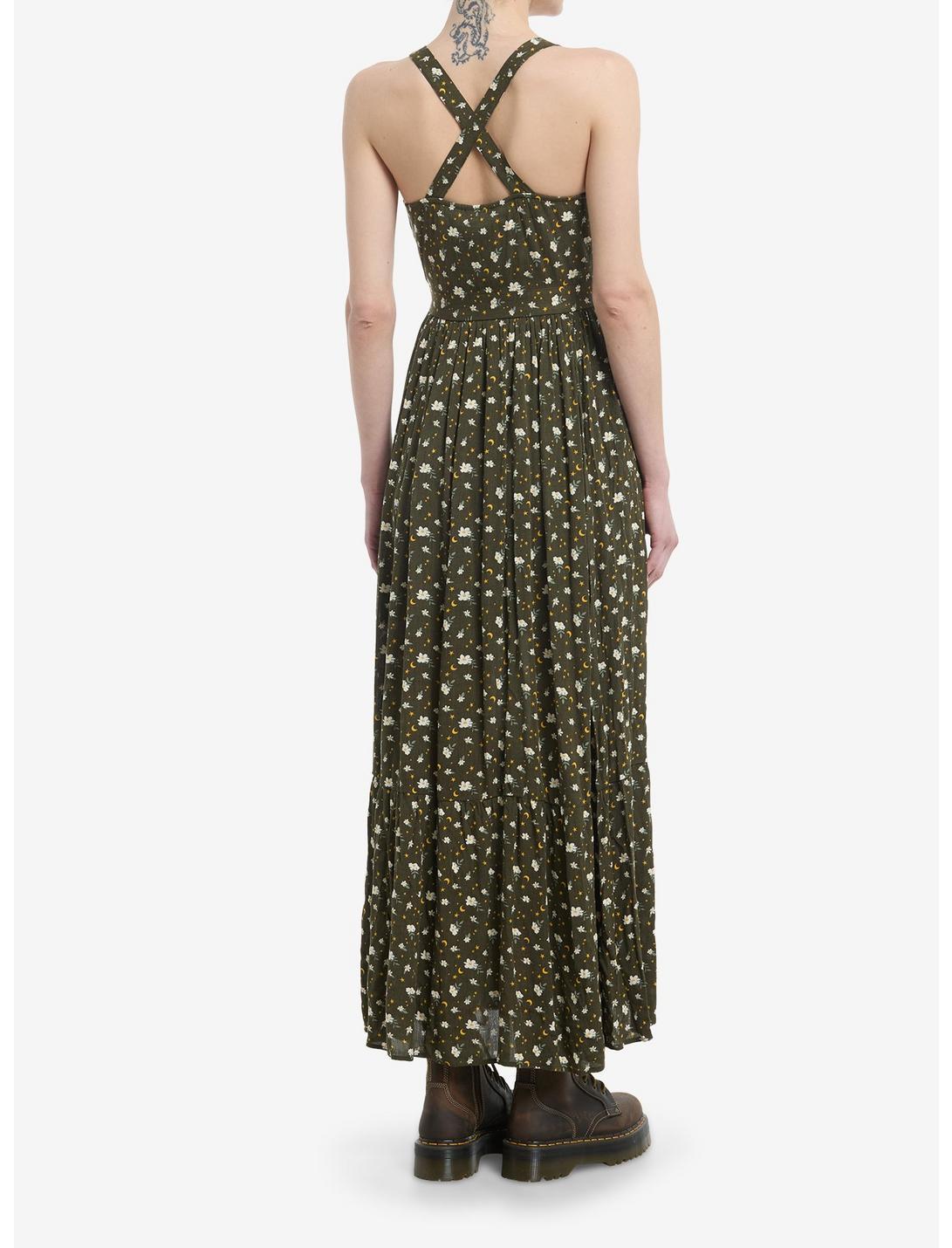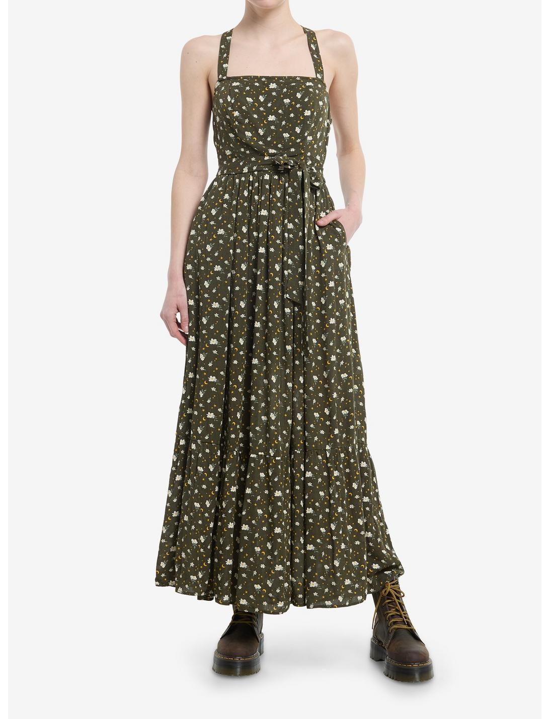 This green maxi dress is straight from your cottagecore dreams! Featuring an allover floral and celestial print, plus a flowy wrap skirt. Comes with crisscross shoulder straps.Please note: Style is fitted with no stretch; size up for a looser fit.80% polyester; 20% rayonWash cold; dry lowNon-stretch materialImportedListed in junior sizesModel is 5'10''Model wears size Small