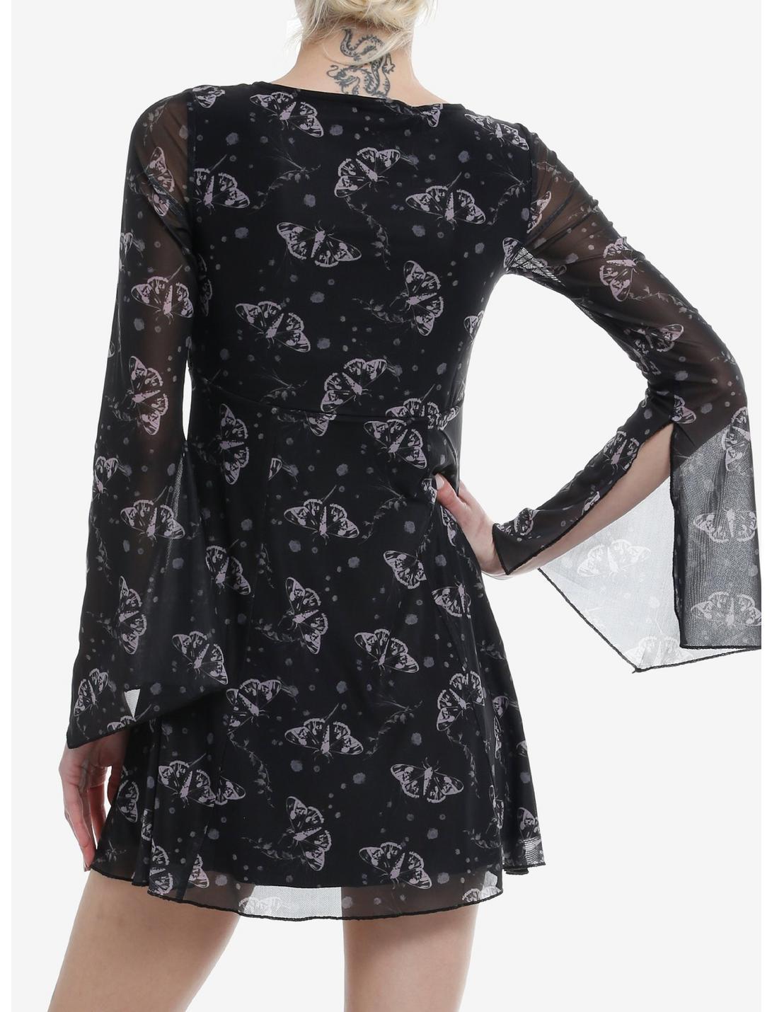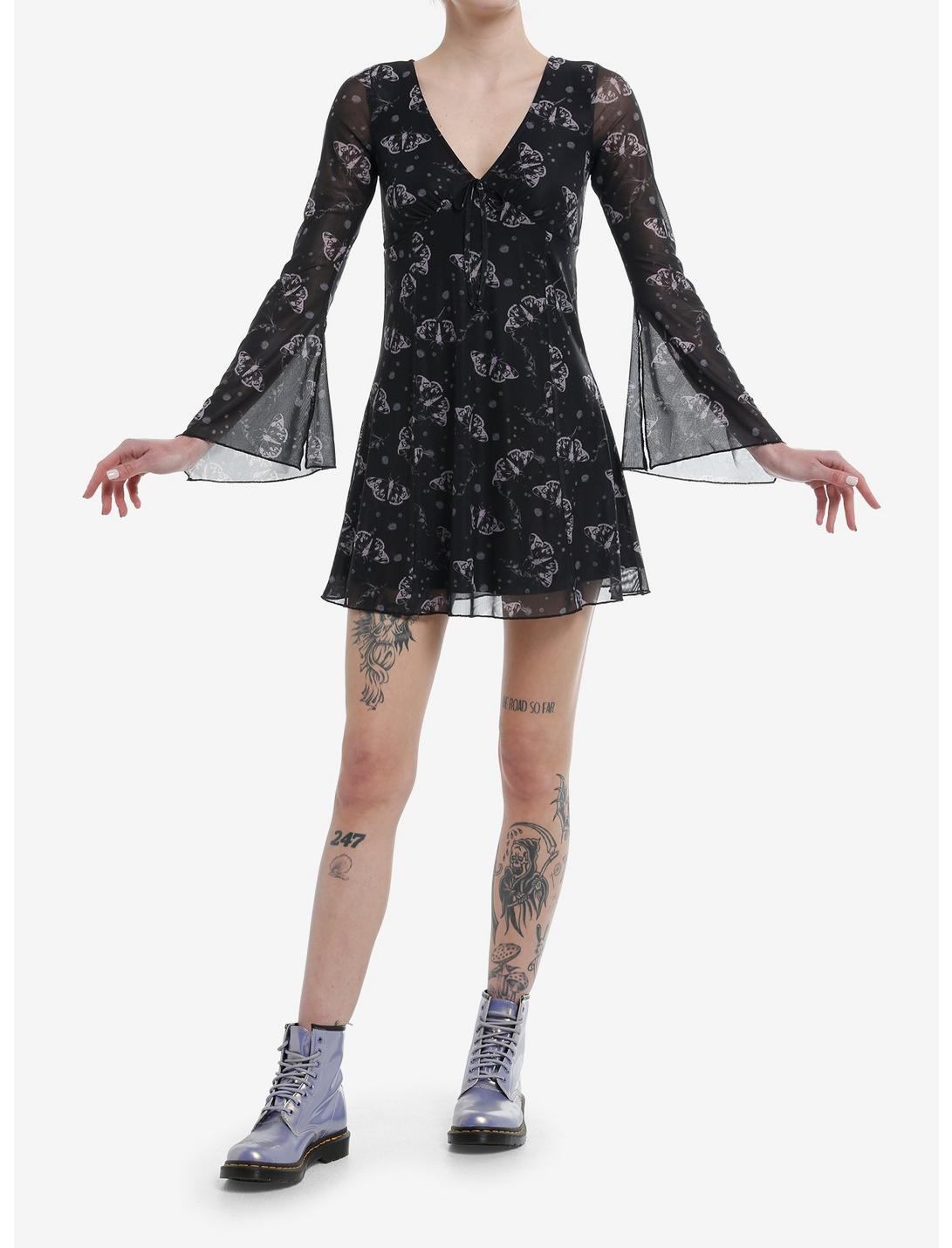 Flutter around in this black dress! Featuring a mesh overlay with purple-tint moths all over. Comes with ruching and tie detailing at the bust, plus dramatic bell sleeves.90% polyester; 10% spandexWash cold; dry lowStretchy materialLength: 32''ImportedListed in junior sizesModel is 5'10''Model wears size Small