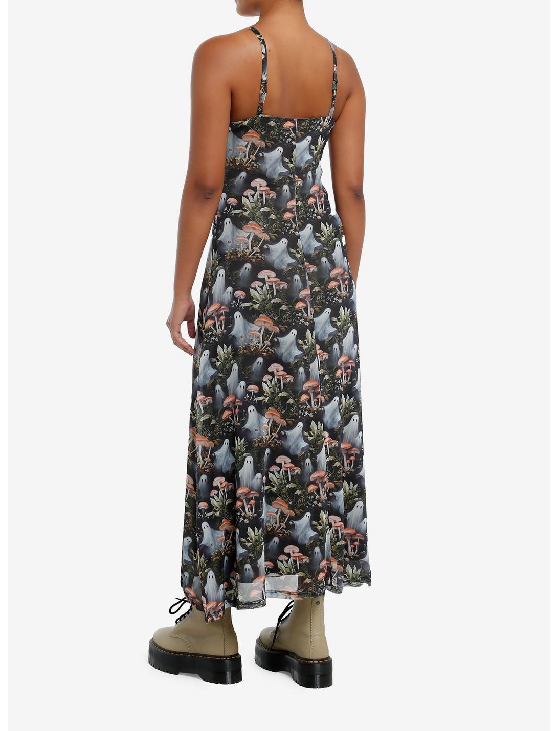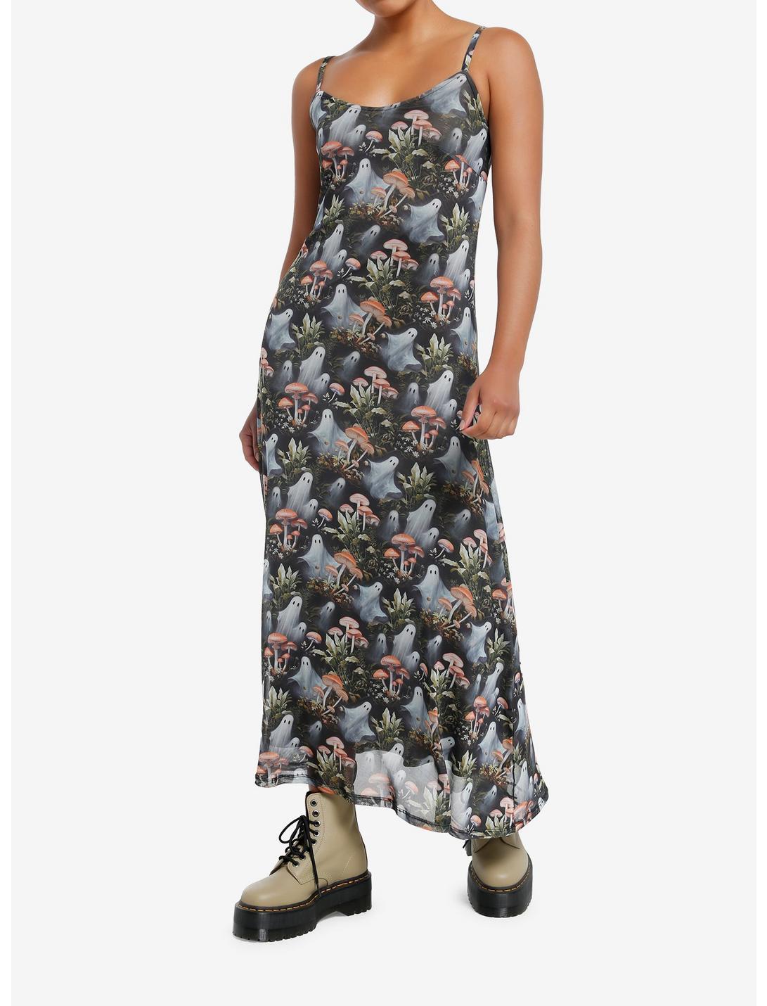 Time to bring some glorious gloom to spring! This strappy mesh midaxi dress has a moody allover print of ethereal ghosts, mushrooms and forest foliage. It is lined with a short slip and has adjustable straps.95% polyester; 5% spandexWash cold; dry lowLength: 55"ImportedListed in junior sizesModel is 5'9"Model wears size Small