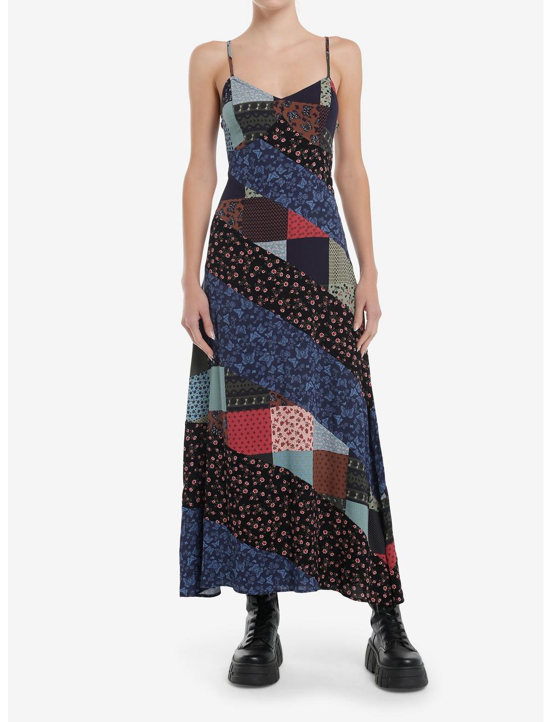 Make room in your closet for a new whimsical piece! This maxi dress features an allover patchwork design with stripes of other floral prints mixed in. Comes with adjustable cami straps and a sweetheart neckline.100% rayonWash cold; dry lowLength: 45"No stretchAdjustable strapsImportedListed in junior sizesModel is 5'10"Model wears size Small
