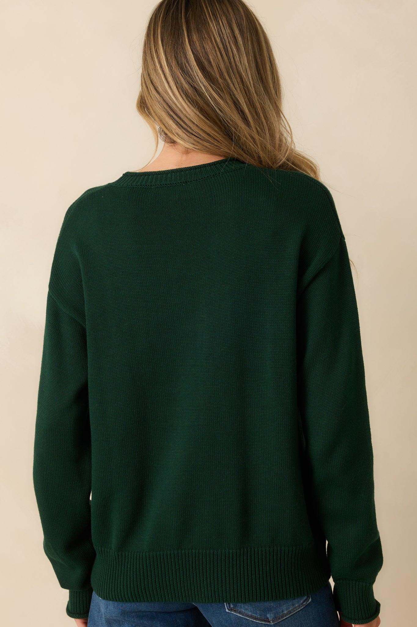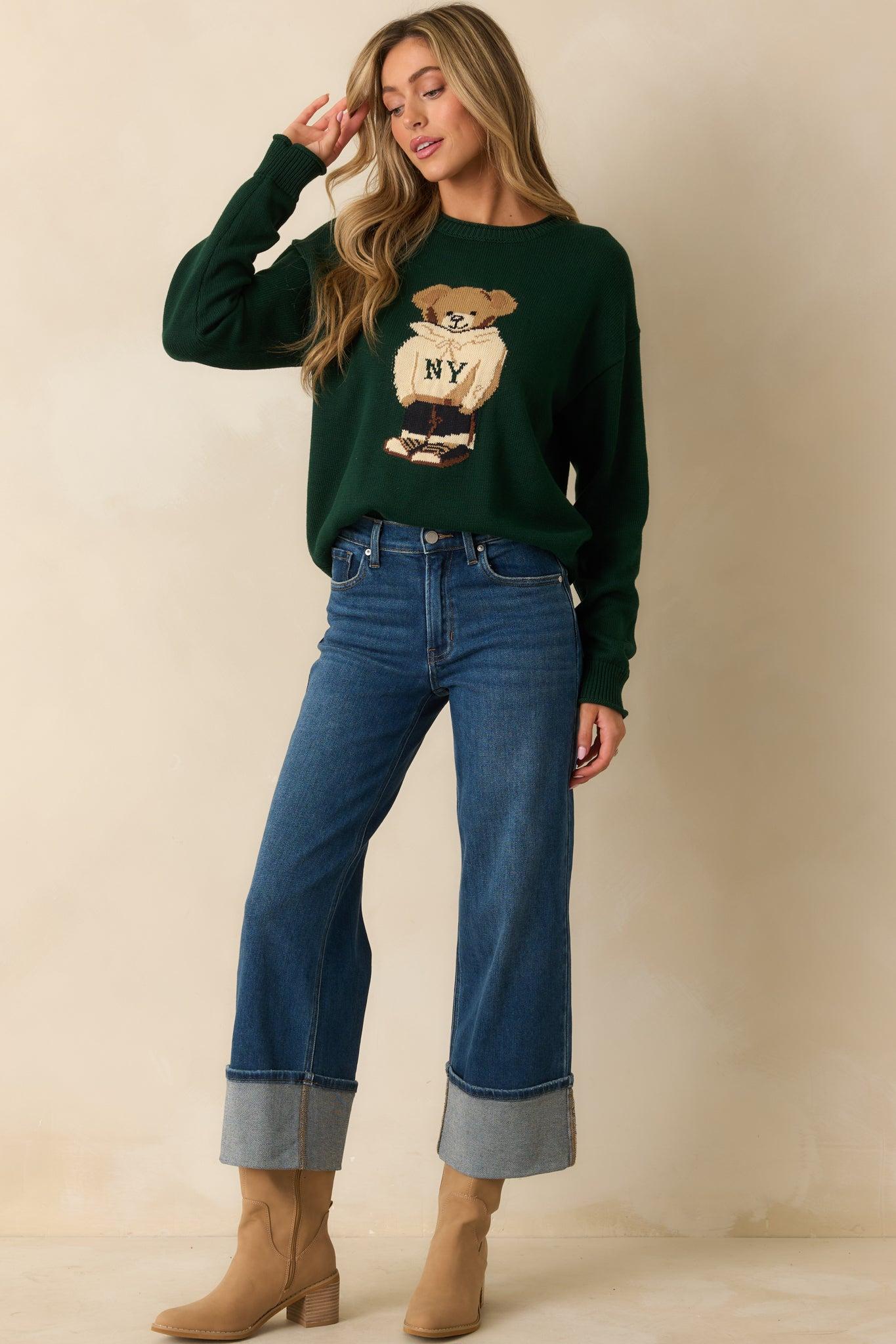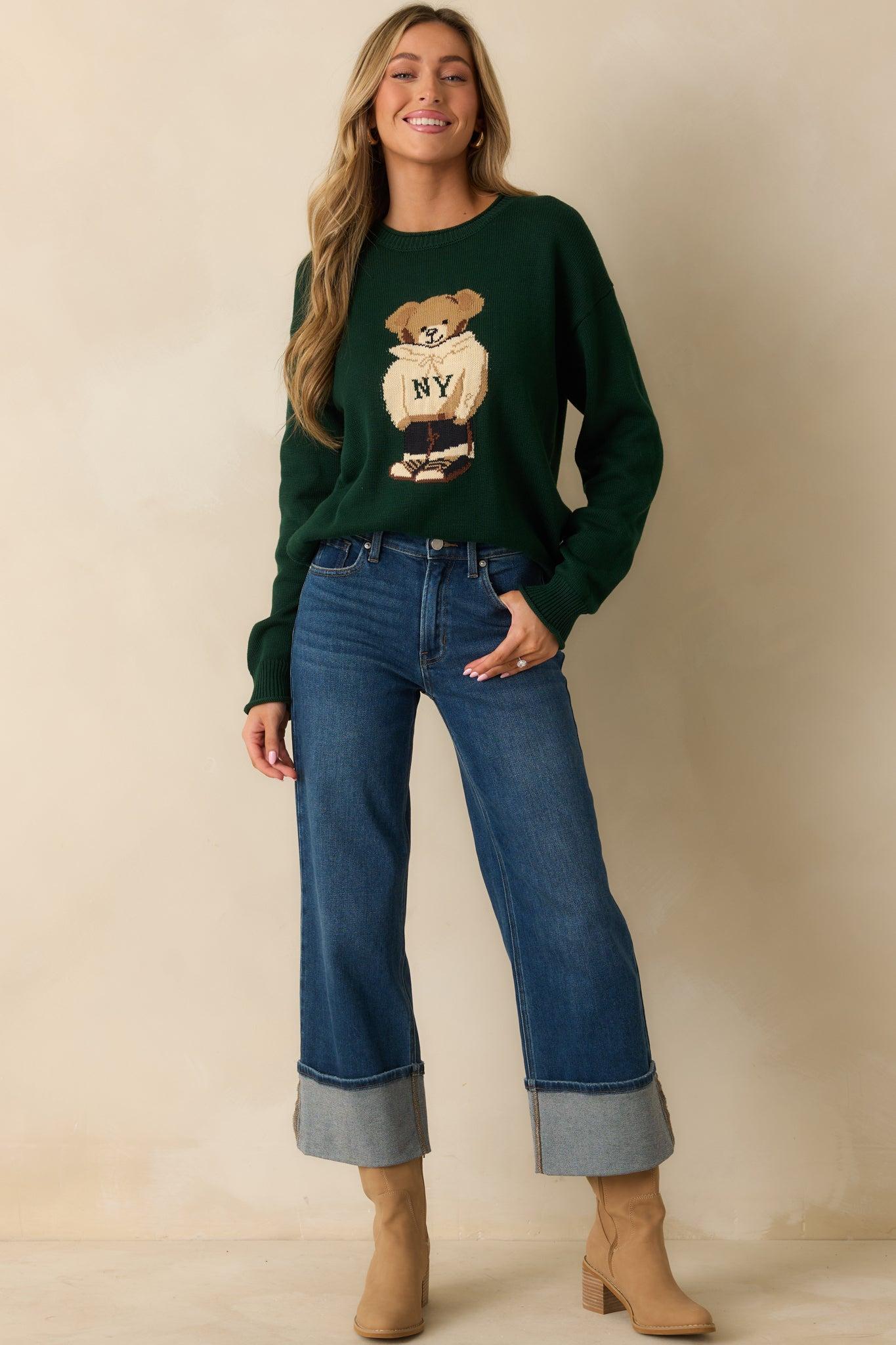 The Don’t Wait Around Hunter Green Teddy Bear Graphic Crewneck Sweater brings playful energy to cooler days, a cozy knit that makes casual dressing feel fun and effortless. This hunter green sweater features a charming teddy bear graphic wearing an ivory “NY” hoodie, a crew neckline, long sleeves, ribbed hems, and a relaxed fit. 55% Acrylic & 45% Cotton Unlined Hand Wash Cold Manufactured in China Designed in The USA Model is 5'8" and is Wearing a Size Small