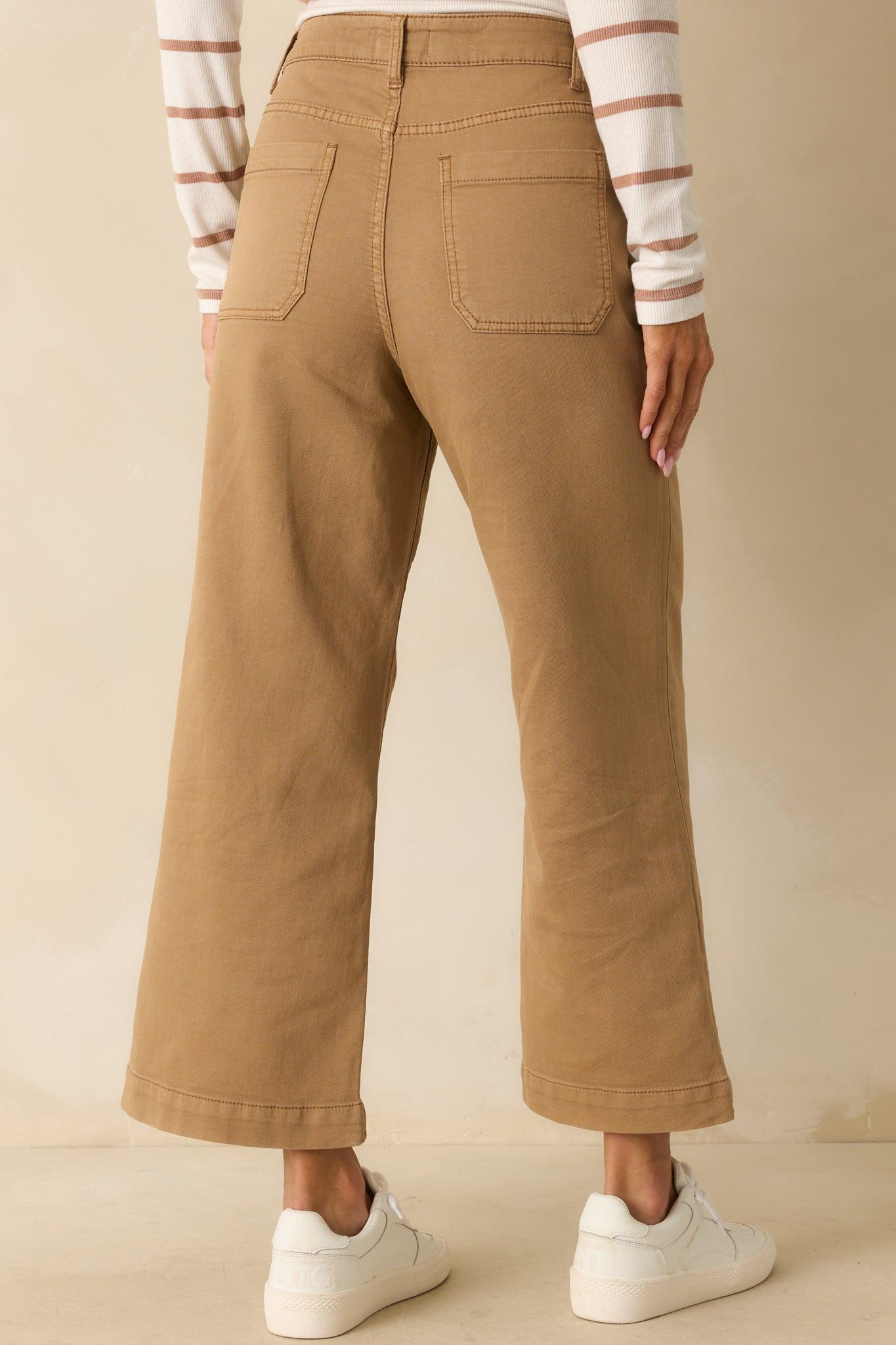 The Thread & Supply Tan Brown Cotton Sophia Pants are versatile in style while adding a neutral tone that blends seamlessly into your wardrobe. These tan brown pants feature a high rise waist, functional front button and zipper closure, functional front and back patch pockets, wide leg silhouette, cropped length, and belt loops. 72% Cotton, 24% Polyester, 3% Viscose, & 1% Spandex Unlined Machine Wash Cold Manufactured in China Designed in The USA Model is 5'6" and is Wearing a Size Small