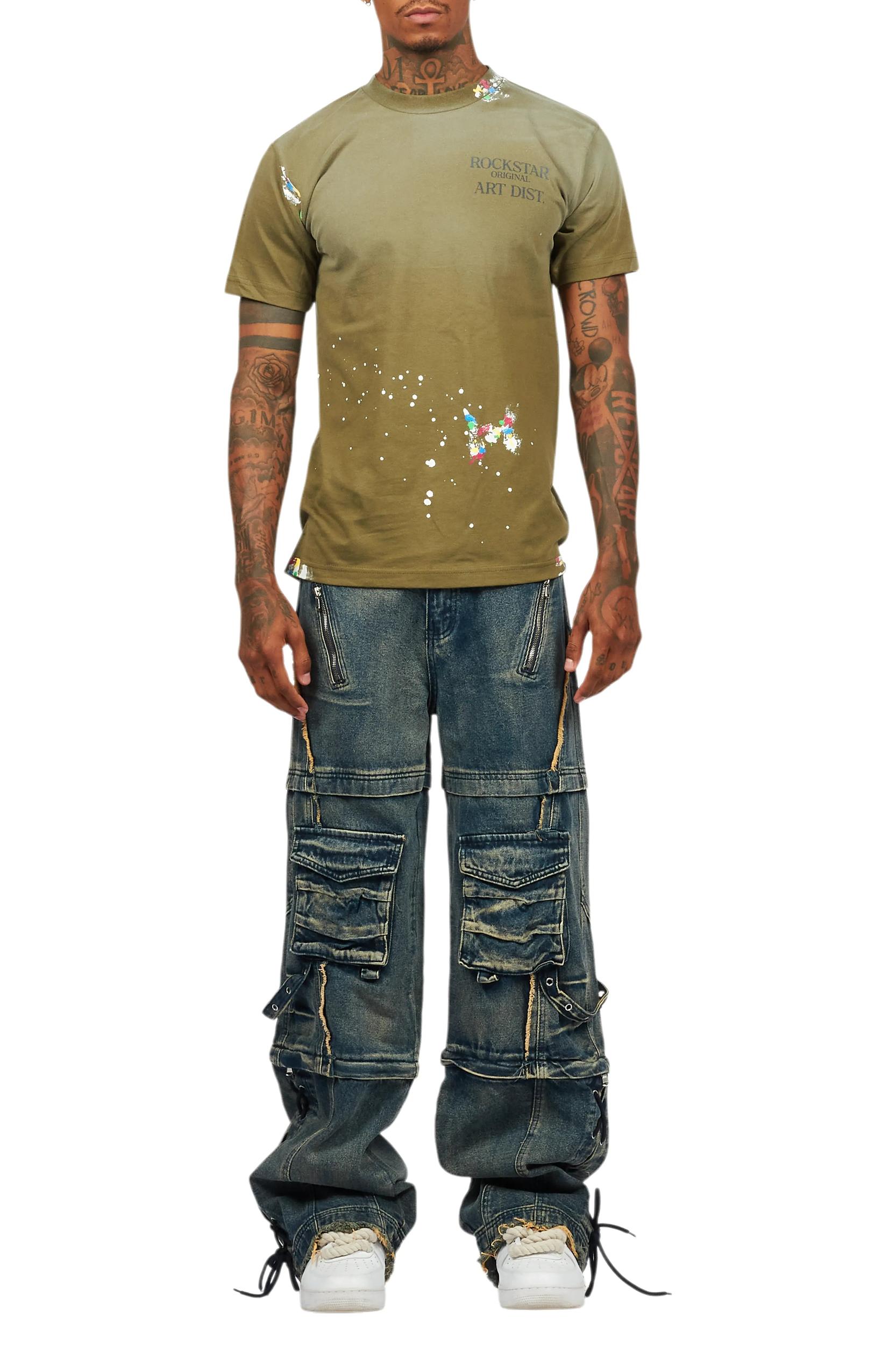 An urban baggy cargo jean for men in blue. Designed with organic cotton and an oversized-fit for an essential streetwear style. Zip fly with button closure 9-pocket build Utility pockets Distressed detailing Tie up seams Parachute pant baggy construction