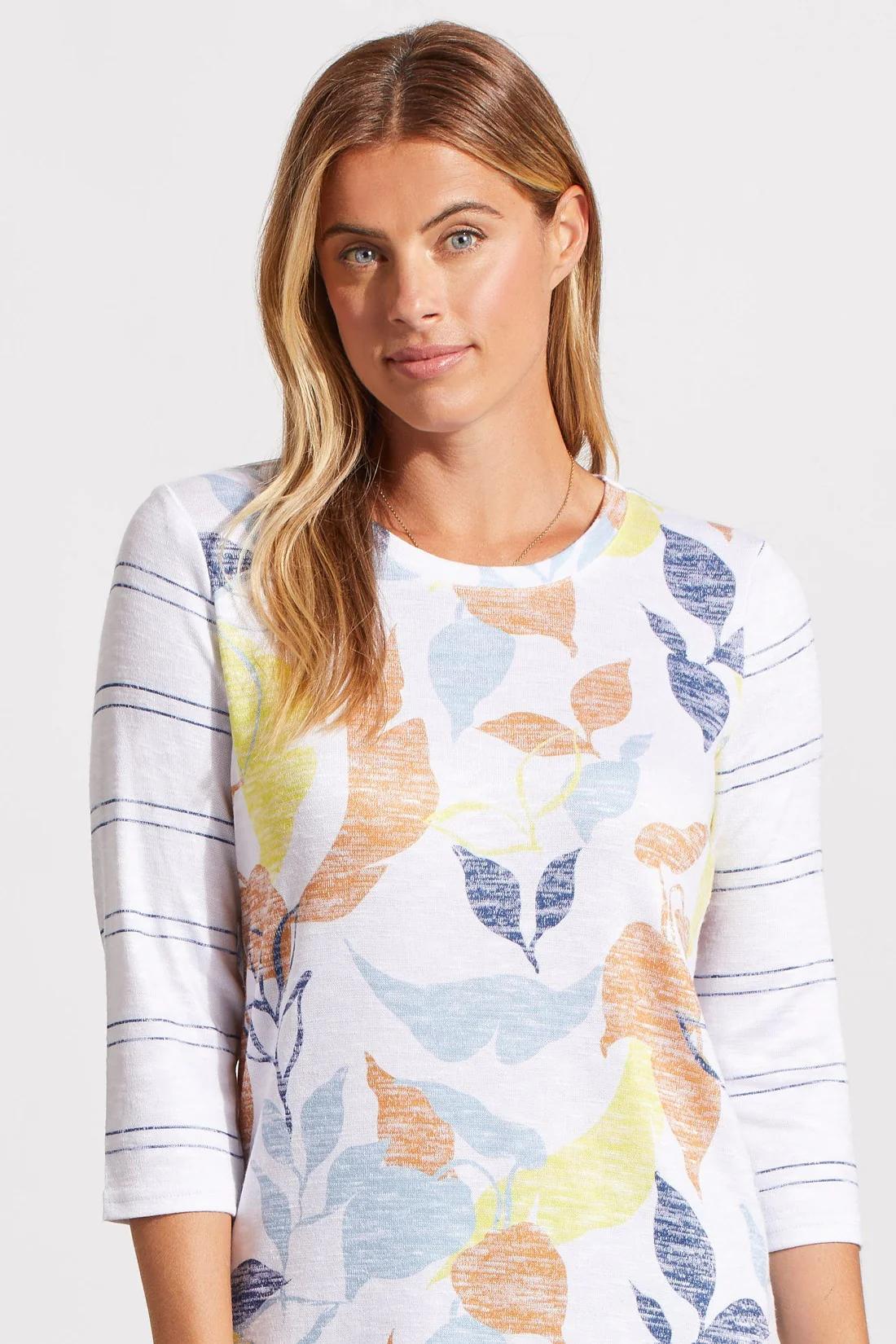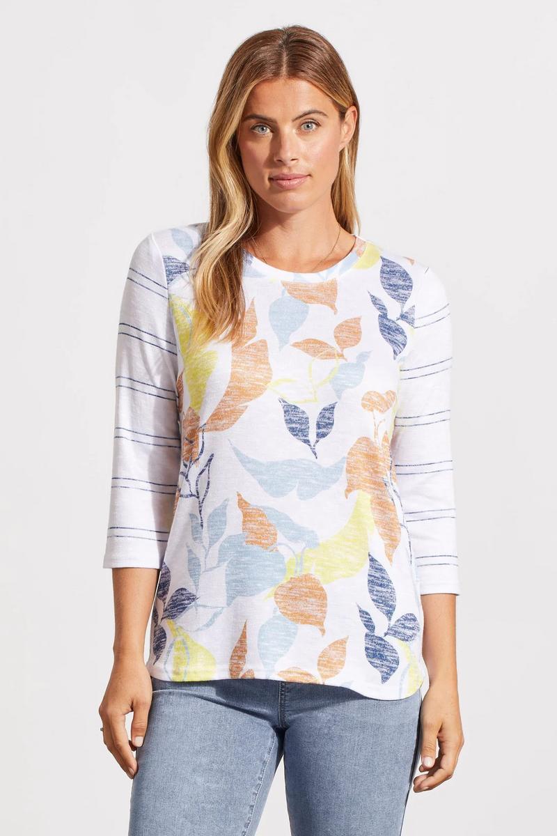 We can't decide which part of this fun top we like best! From the classic crew neckline to the 3/4 length sleeves, soft printed hatchi fabric, curved high-low hem, side slits, and playful combination of prints, this top is headed straight to the top of our closet favorites