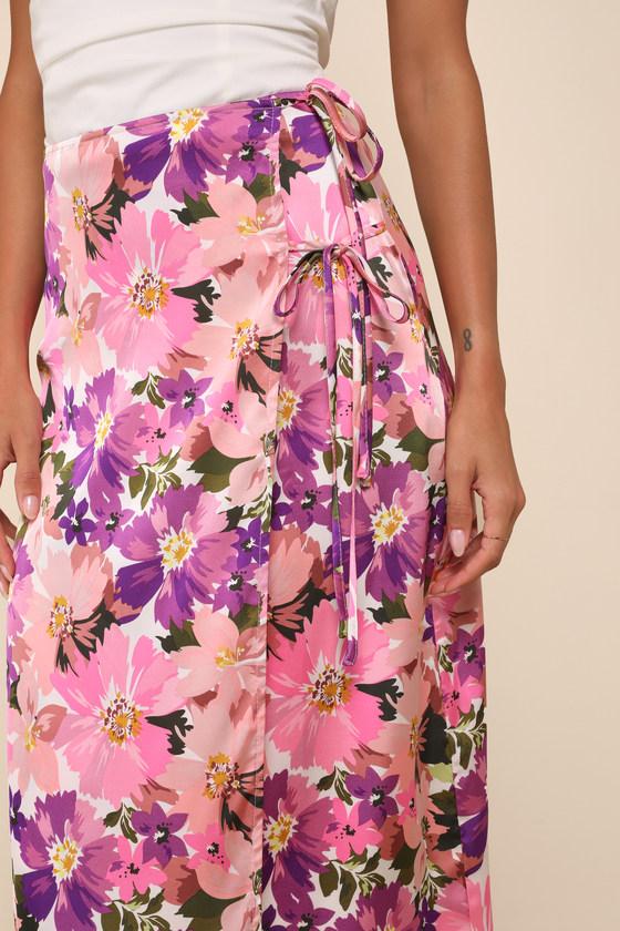 Show off your sweet, stylish self with the Lulus Thriving Spirit Pink Multi Floral Satin Side-Tie Midi Skirt! Lightweight woven satin, with a vibrant floral print, shapes a high-waisted fit and a figure-skimming A-line silhouette. An overlapping panel secures at the side with twin ties to create a faux wrap effect before falling to a chic midi hem. Hidden back zipper/clasp.