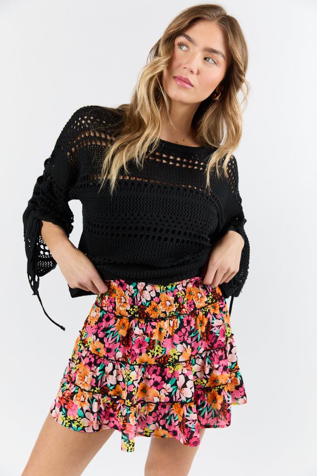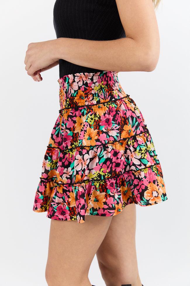 Details Black Multi Color Floral Mini Skort Fabric only has stretch in smocking Smocked waist Lined with shorts Material and Care 100% rayon Hand wash cold, no drum drying Size and Fit Size Small approximate measurements. Waist: 22.5" Hips: 27" Length: 15"