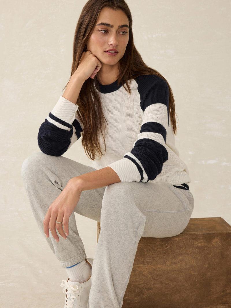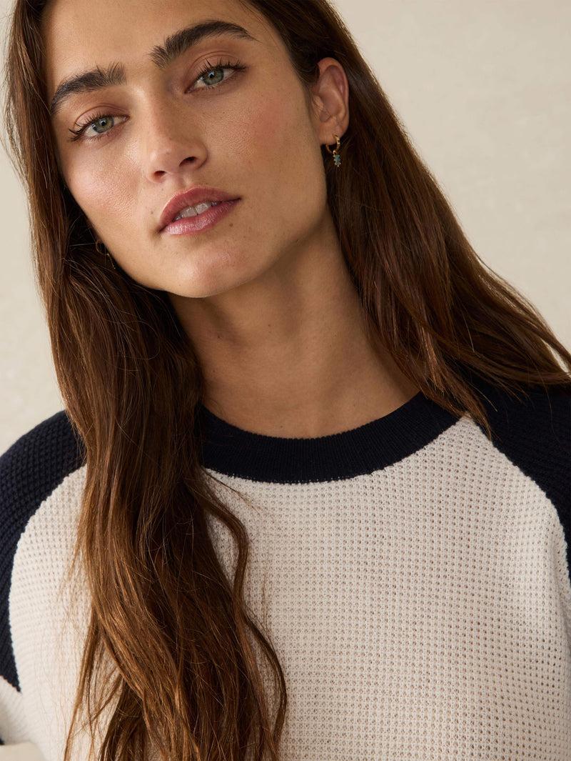 With a nod to nostalgic collegiate sportswear, this classic crewneck gets an elevated update in the softest organic cotton and cashmere yarn. The wonderfully textured waffle stitch lays with a relaxed, no-fuss fit that keeps you toasty and comfy. Play up the sporty stripes and playful color blocking with jeans or a corduroy skirt for a quintessential fall look.