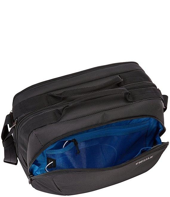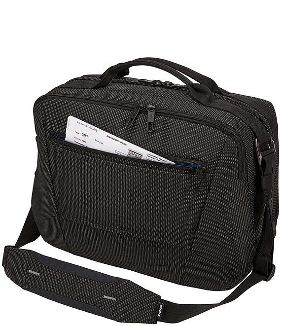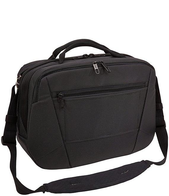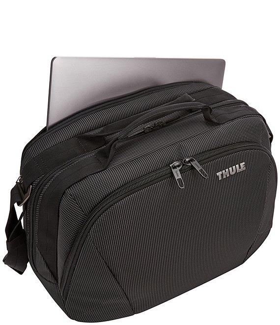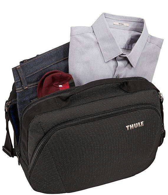 From Thule, this crossover boarding bag features: An underseat-sized cabin bag designed to keep everything you need on board organized, accessible and protected throughout your travels. Organize small electronics and accessories in the front panel with slip pockets, elastic loops, a zippered mesh pocket and the Power Pocket cord management system for charging on the go Safeguard your identity and personal information with a RFID blocking pocket Store 1-2 days of clothes or bulky items in large main compartment Protects approx. 15" laptop in the dedicated, padded storage panel Securely attach to rolling luggage with the pass-through strap Easily access small items in rear slip pocket Multiple carry options include top grab handles and a removable, padded shoulder strap Durable design includes wear-resistant material and oversized YKK zippers Nylon material Thule crossover collection Approx. 9.1" x 16.1" x 11.4" Approx. weight: 2.6 lbs Approx. volume: 25 L Imported.