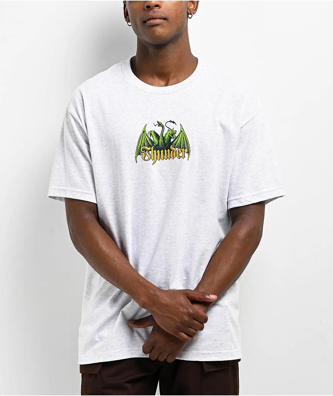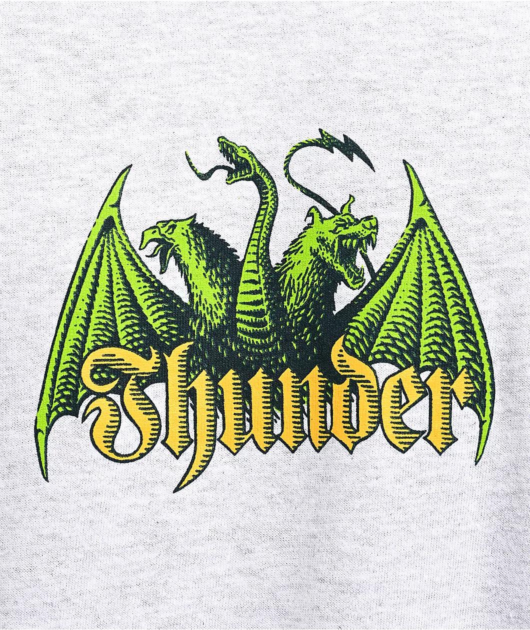 Thunder Trucks offers the Medieval t-shirt in a lightweight heather grey cotton blend, highlighting a printed graphic on the front. Underlined by Old English branding, an image of a mythological three-headed winged beast adorns the front for a dange