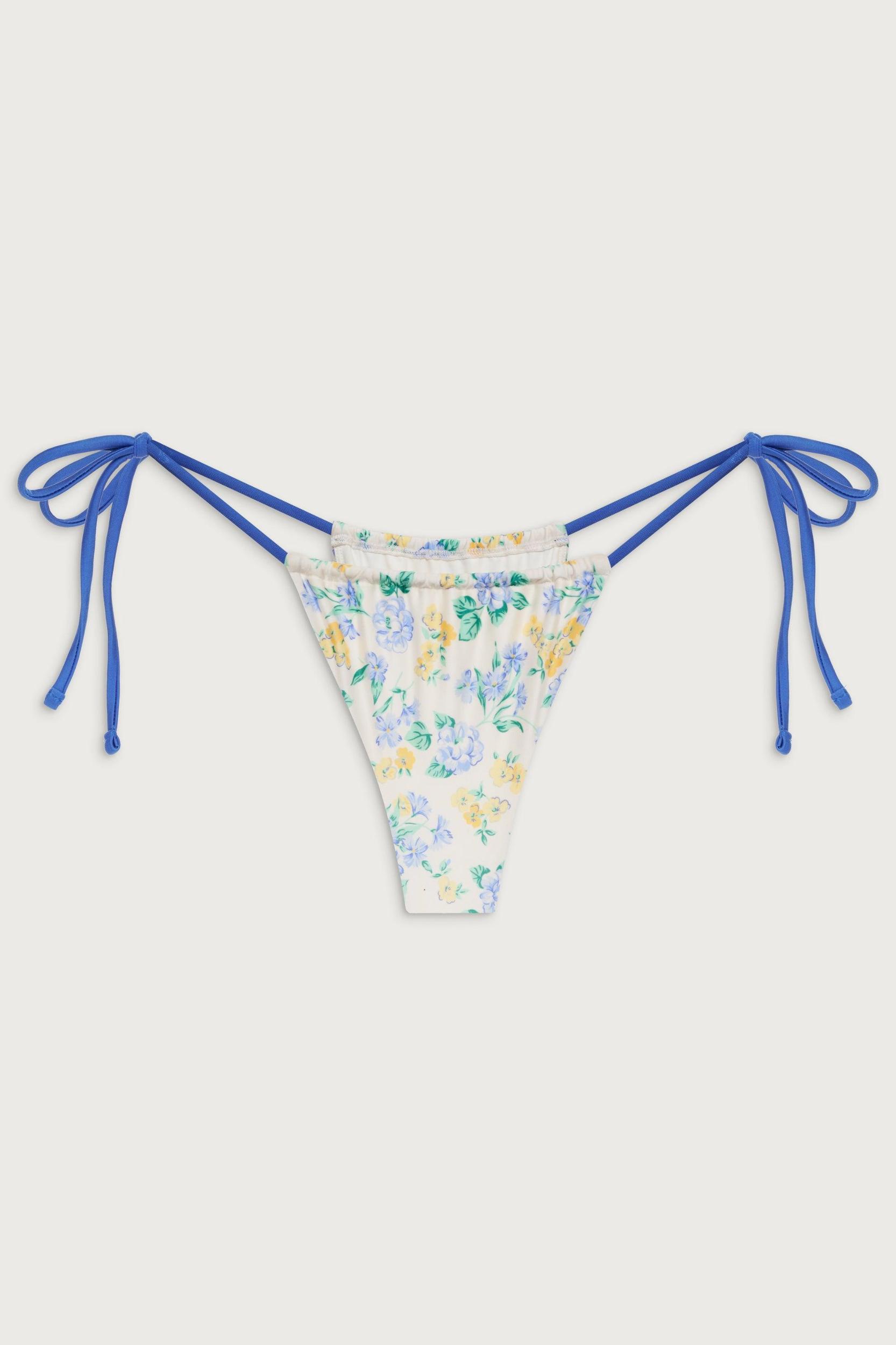 Sexy and slimming with flirty ruched details and string tie sides, the Tia bikini bottom takes the ultimate skimpy silhouette to a new level. This bikini bottom is designed with glistening shine fabric and our new Coastal Floral print. Complete the set with the matching Crescent bikini top. Fabric 81% Nylon + 19% Spandex Satin Swim Adjustable Side Ties Skimpy Coverage Model Size & Fit This style runs true to size Jasmine is wearing a size Small Height 5’9” (175cm) Bust 34" (86cm), Waist 23.5" (60cm), Hips 34” (86cm)
