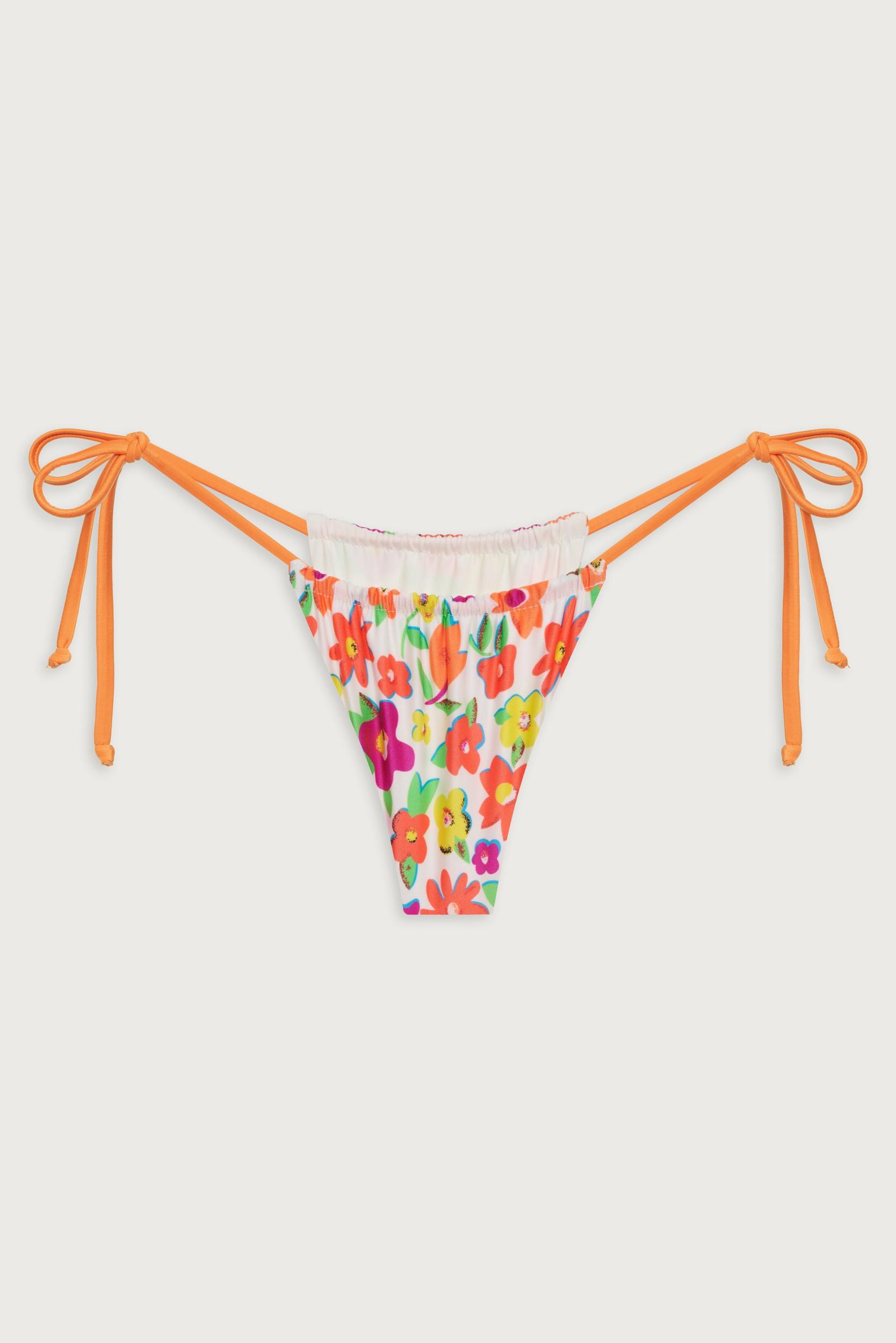 Sexy and slimming with a flirty ruched detail, glistening shine fabric, and string side ties, the Tia bikini bottom takes the ultimate skimpy silhouette to a new level. This bikini bottom is designed in a new vintage-inspired floral print, French Flower. Complete the set with the matching Coastal bikini top. Fabric 81% Nvlon + 19% Spandex Satin Swim Adjustable Side Ties Skimpy Coverage Model Size & Fit This style runs true to size Anna is wearing a size Small Height 5’10”(179.07cm) Bust 32” (81.5cm), Waist 23.5" (60cm), Hips 34.5” (88cm)
