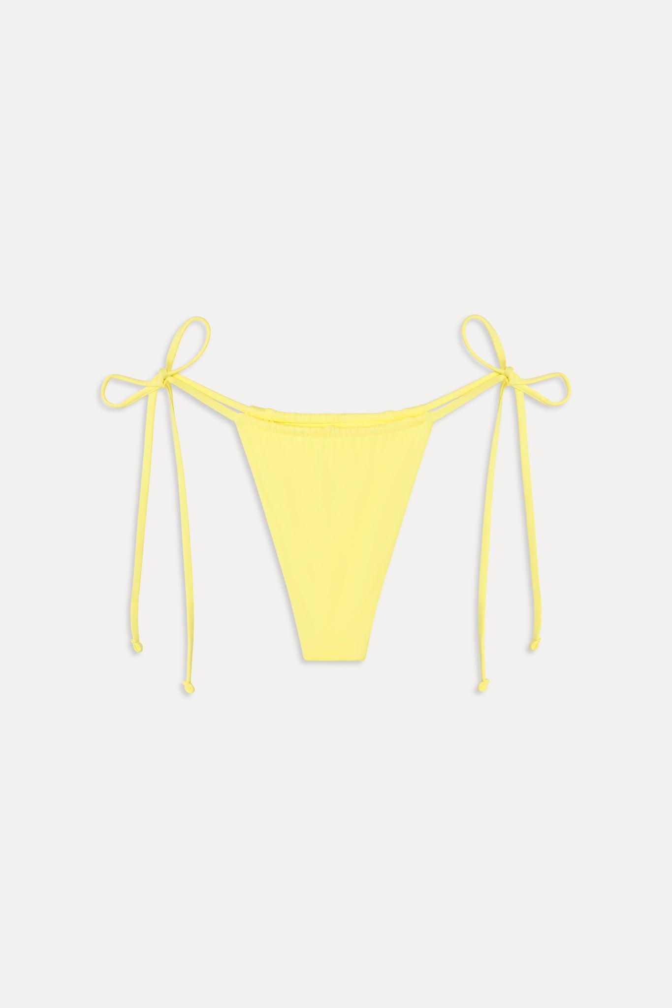 Sexy and slimming with a flirty ruched detail and thin string side ties, the Tia bikini bottom takes the ultimate skimpy silhouette to a new level. Details Mid rise bikini bottom Ruched detailing Designed in a new shade of Yellow Iris Signature soft swim fabric