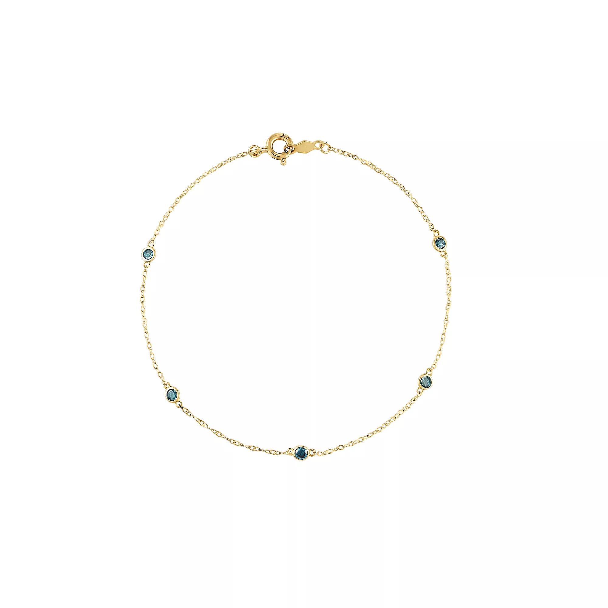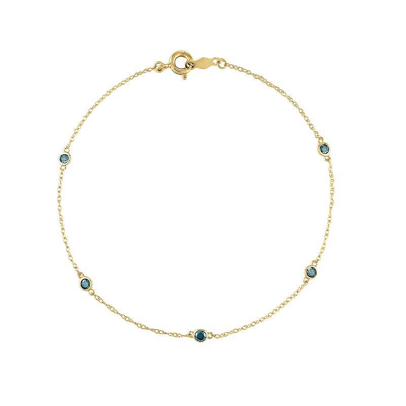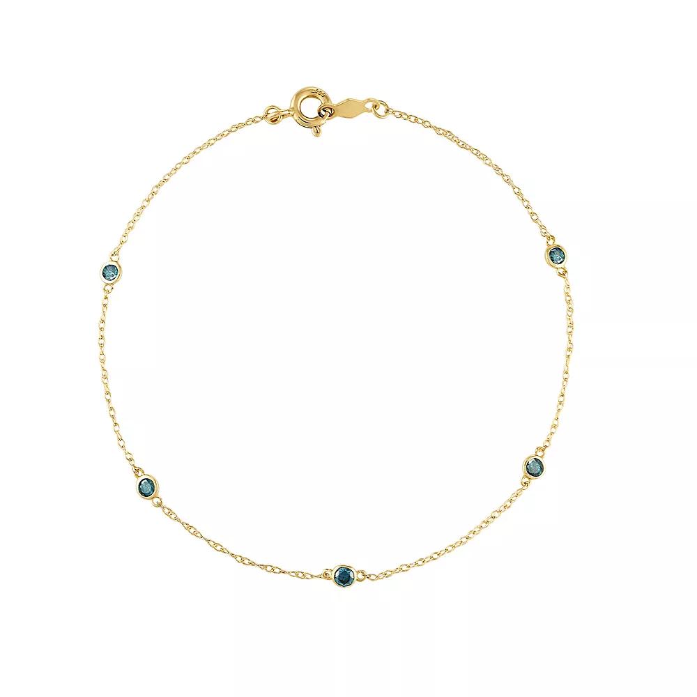 Adorn yourself with this charming Tiara blue diamond station bracelet. Adorn yourself with this charming Tiara blue diamond station bracelet. Nickel free Metal: 14k gold Length: 7.25 in. Packaging: boxed Finish: polishedDIAMOND DETAILS Total weight: 1/4 ct. Color: blue Shape: round Setting: channel Diamond weights are approximate. Diamond Total Weights may vary between .01 and .13 ct. Some diamonds consist of fewer than 17 facets. Gemstones may have been treated to enhance their appearance. Special care may be required. Please visit our Gemstone Treatment & Special Care Guide for more information. Image(s) may be enlarged to show detail. Please note, due to the high value of this item, a signature may be required upon delivery. Size: 7.25. Color: Yellow. Gender: female. Age Group: adult.