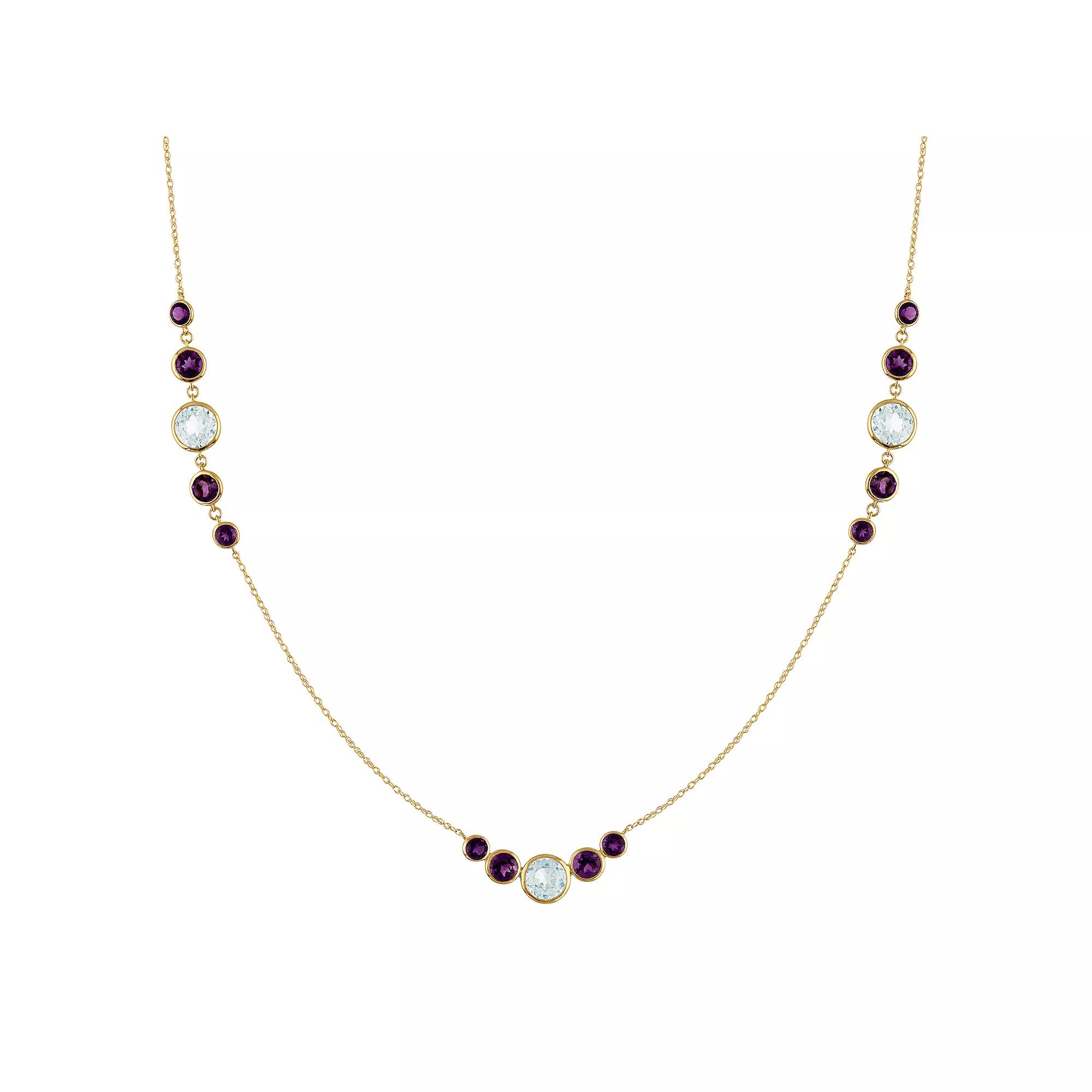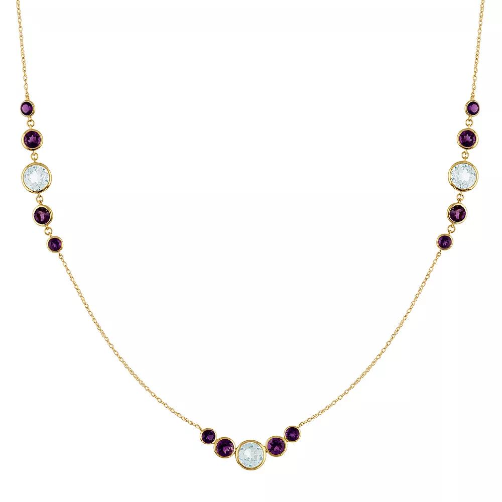 Fashioned with blue topaz and amethyst, this Tiara station necklace is a charming and exquisite accessory. Fashioned with blue topaz and amethyst, this Tiara station necklace is a charming and exquisite accessory. Nickel free Metal: 14k gold Chain length: 18 in. + 0.5-in. extender Packaging: boxed Finish: polished Chain type: cableSTONE DETAILS Stone type: amethyst, blue topaz Total weight: 3 3/4 ct. Center stone weight: 9/10 ct. Center stone size: 6 mm x 6 mm Shape: round Setting: channel Gemstones may have been treated to enhance their appearance. Special care may be required. Please visit our Gemstone Treatment & Special Care Guide for more information. Please note, due to the high value of this item, a signature may be required upon delivery. Size: 18. Color: Yellow. Gender: female. Age Group: adult.