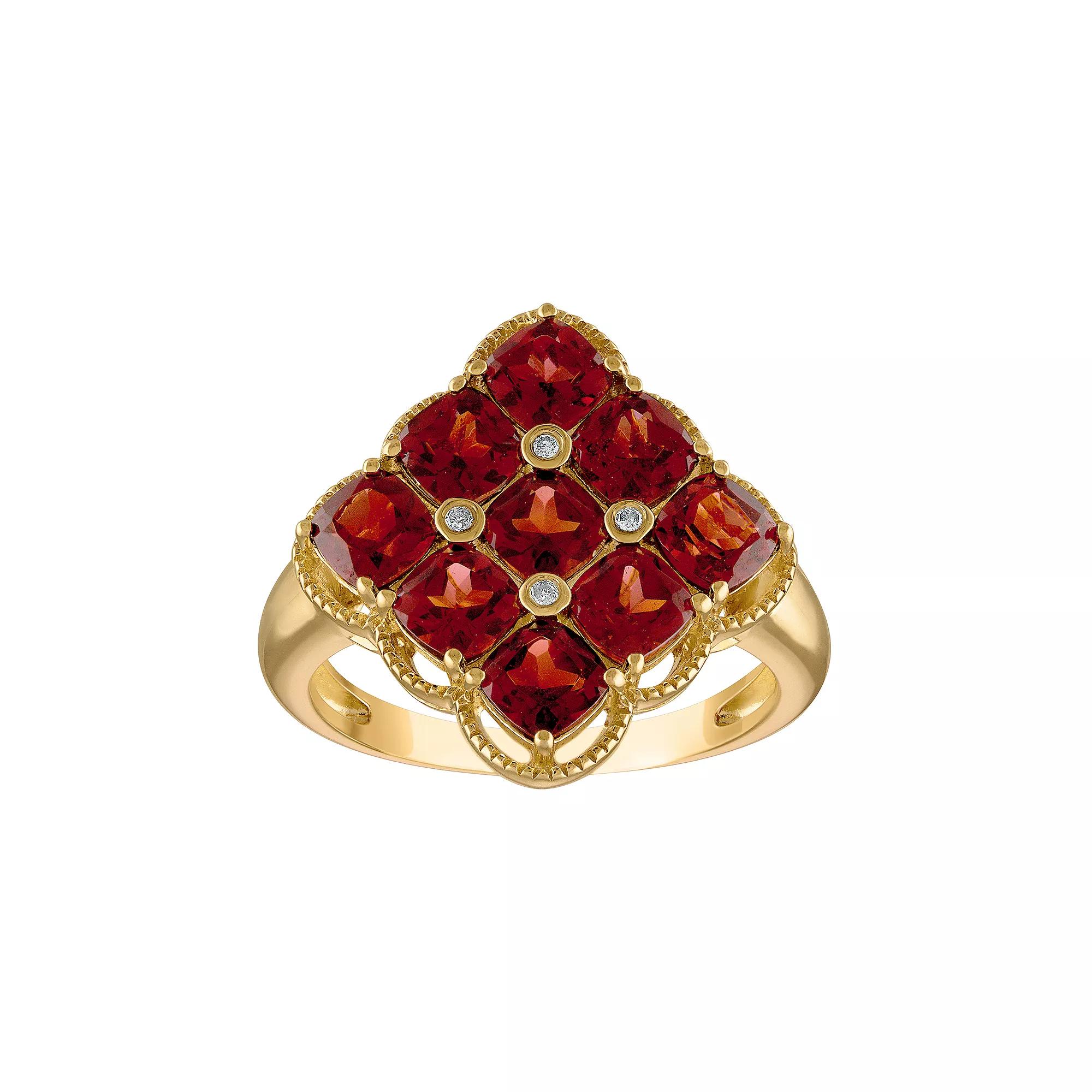 Add an enchanting touch to your ensembles when you wear this dazzling Tiara garnet and diamond accent ring. Add an enchanting touch to your ensembles when you wear this dazzling Tiara garnet and diamond accent ring. Nickel free Metal: sterling silver Packaging: boxed Plating: 14k gold Width: 18.5 mm Finish: polishedSTONE DETAILS Stone type: garnet Total weight: 3 1/2 ct. Center stone weight: 3 3/8 ct. Center stone size: 4 mm Shape: cushion cut Setting: prongDIAMOND DETAILS Total weight: less than 1/10 ct. Setting: bezel Shape: round Gemstones may have been treated to enhance their appearance. Special care may be required. Please visit our Gemstone Treatment & Special Care Guide for more information. Image(s) may be enlarged to show detail. Please note, due to the high value of this item, a signature may be required upon delivery. Size: 9. Color: Yellow. Gender: female. Age Group: adult. Material: Gold Over Sterling.