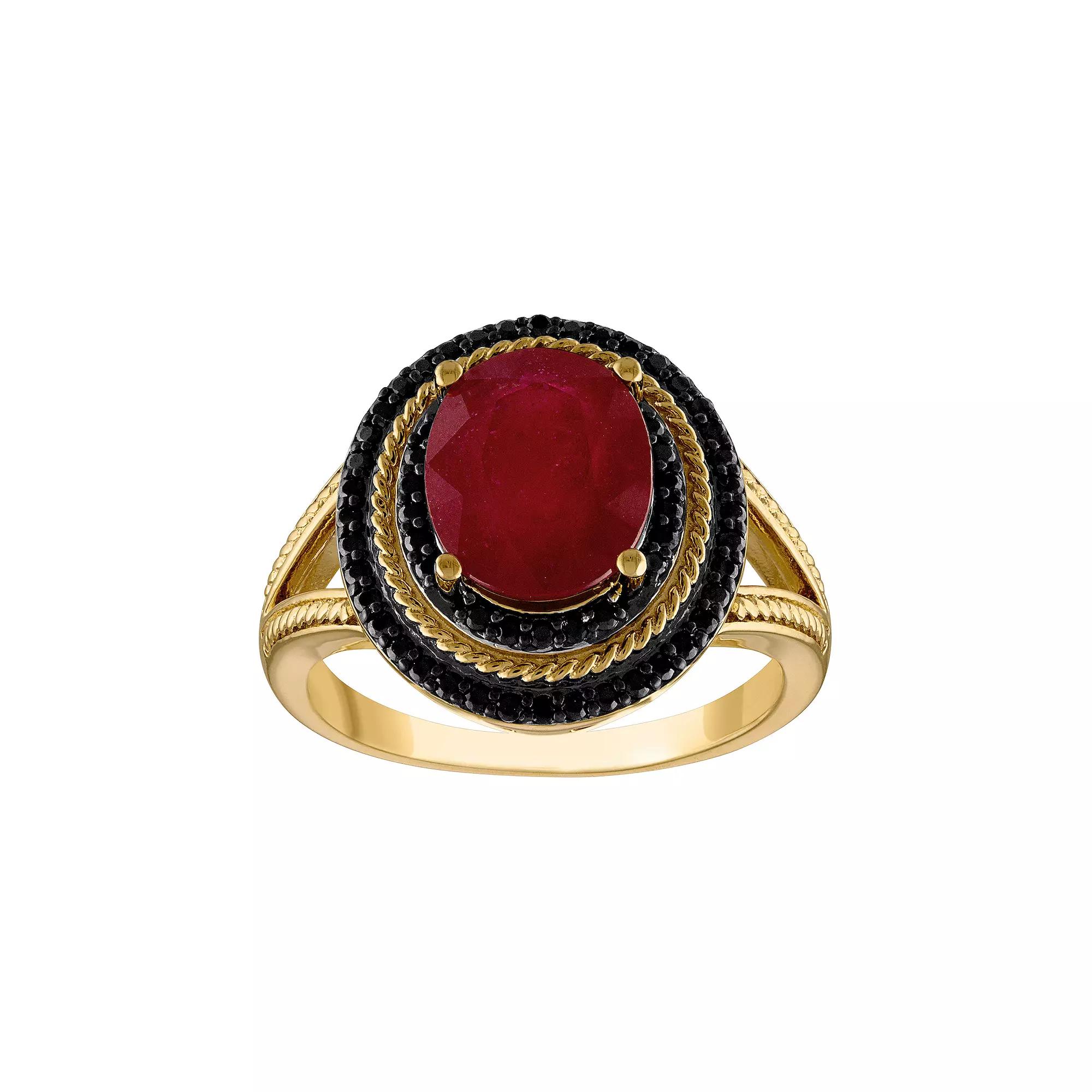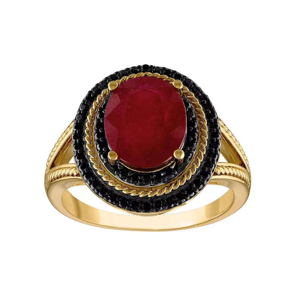Adorned with an oval-cut ruby stone and accented by halos of black spinel accents, this Tiara ring is simply gorgeous. Adorned with an oval-cut ruby stone and accented by halos of black spinel accents, this Tiara ring is simply gorgeous. Nickel free Metal: sterling silver Packaging: boxed Plating: 14k gold Width: 16 mm Finish: polishedSTONE DETAILS Stone type: ruby Total weight: 3 7/8 ct. Center stone weight: 3 1/2 ct. Center stone size: 10 mm x 8 mm Shape: oval Setting: prong Gemstones may have been treated to enhance their appearance. Special care may be required. Please visit our Gemstone Treatment & Special Care Guide for more information. Please note, due to the high value of this item, a signature may be required upon delivery. Color: Yellow. Gender: female. Age Group: adult. Material: Gold Over Sterling.