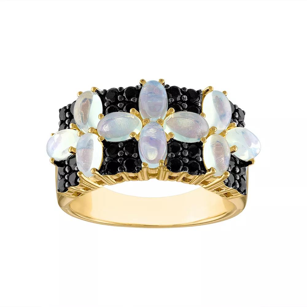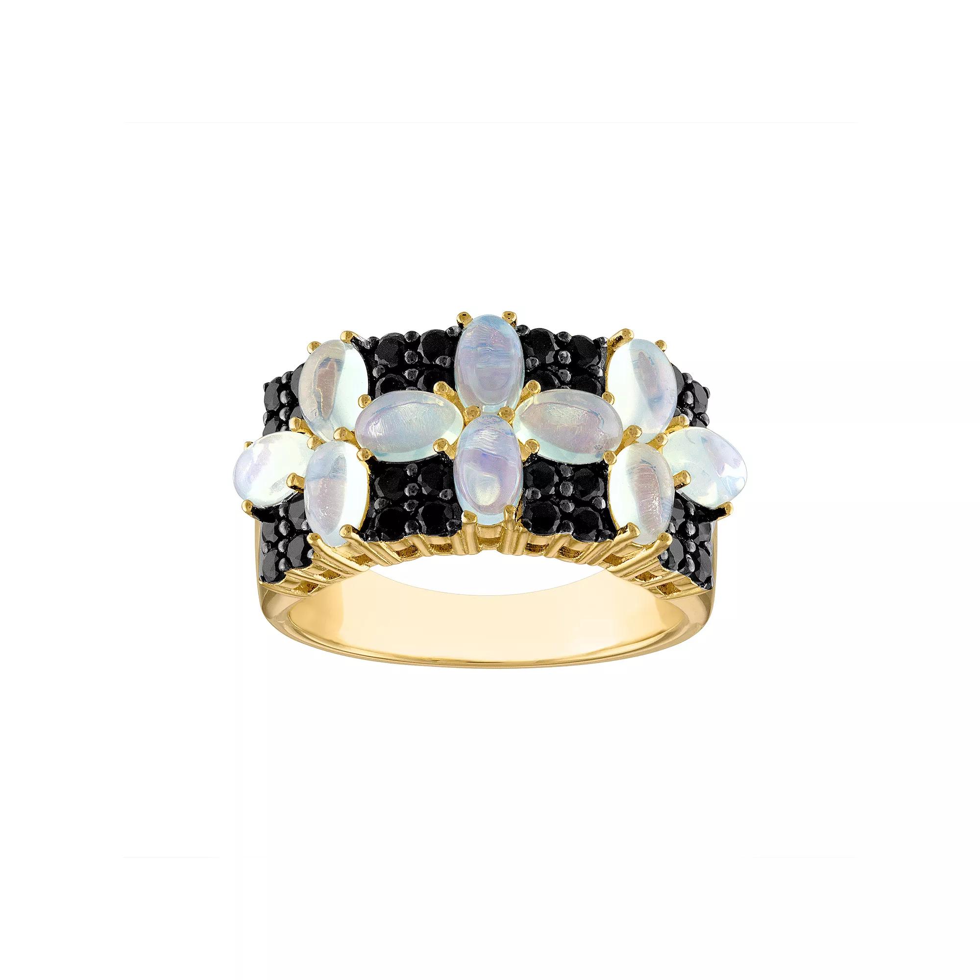 Marquise-shaped white opal cabochons and contrasting black spinel accents combine to give this Tiara ring an enchanting floral design. Marquise-shaped white opal cabochons and contrasting black spinel accents combine to give this Tiara ring an enchanting floral design. Nickel free Metal: sterling silver Packaging: boxed Plating: 14k gold Width: 29 mm Finish: polishedSTONE DETAILS Stone type: white opal Total weight: 2 3/4 ct. Center stone weight: 1 3/4 ct. Center stone size: 5 mm x 3 mm Shape: oval Setting: prong Gemstones may have been treated to enhance their appearance. Special care may be required. Please visit our Gemstone Treatment & Special Care Guide for more information. Please note, due to the high value of this item, a signature may be required upon delivery. Color: Yellow. Gender: female. Age Group: adult. Material: Gold Over Sterling.