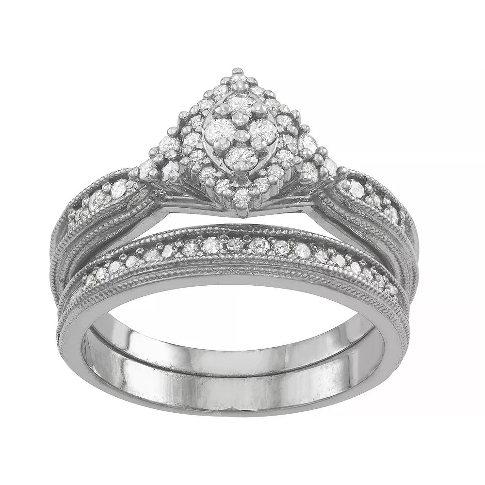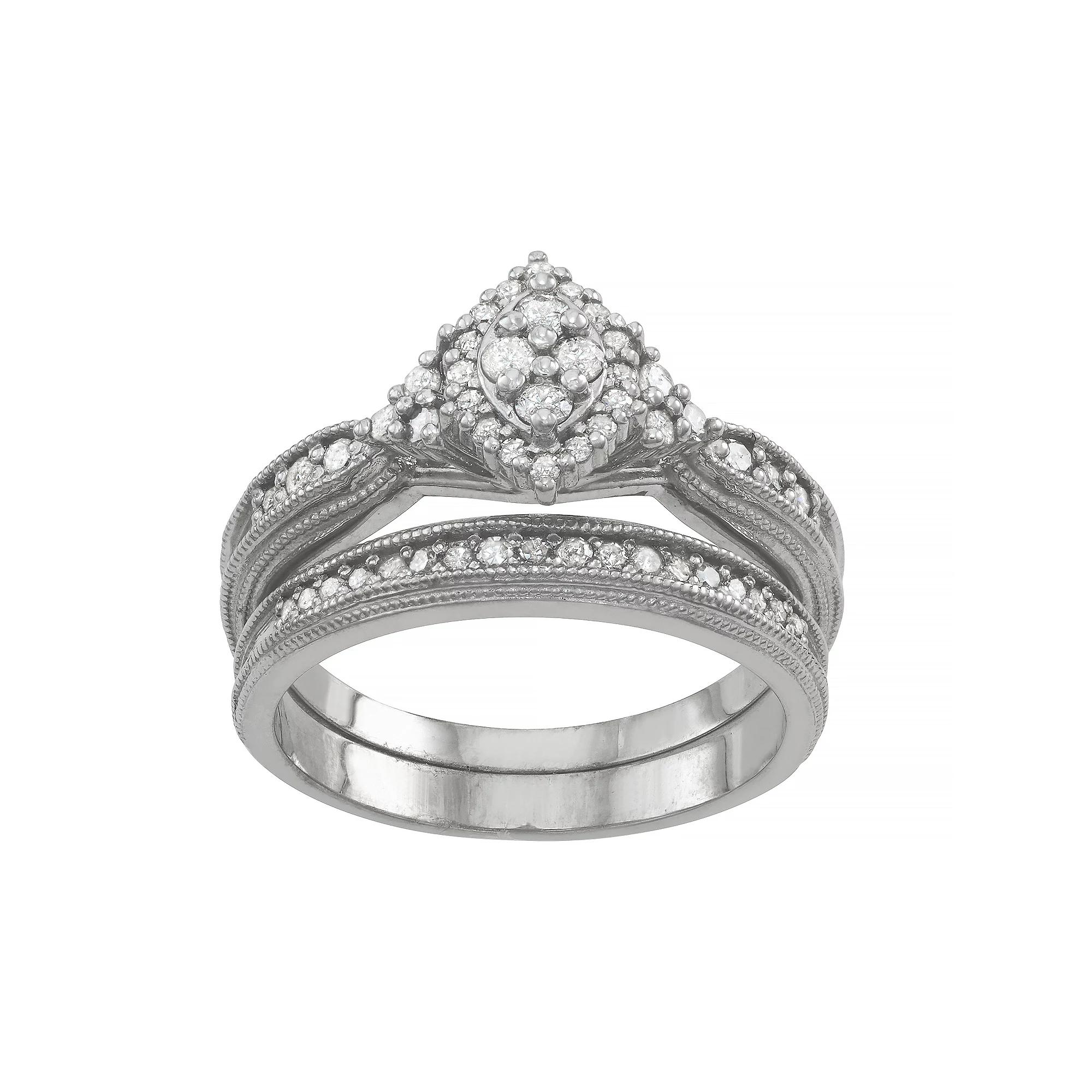 Shell love the elegant beauty of this sterling silver bridal set. Complete with an engagement ring and matching wedding band, this stunning set is an unforgettable symbol of your commitment. Shell love the elegant beauty of this sterling silver bridal set. Complete with an engagement ring and matching wedding band, this stunning set is an unforgettable symbol of your commitment. Includes: engagement ring & matching wedding band Width: 11 mm Metal: sterling silver Plating: rhodium Finish: polished Additional details: milgrain Packaging: boxedDIAMOND DETAILS Total weight: 1/2 ct. Shape: round Setting: prong Gemstones may have been treated to enhance their appearance. Special care may be required. Please visit our Gemstone Treatment & Special Care Guide for more information. Diamond weights are approximate. Diamond total weights may vary between .01 and .08 ct. Some diamonds have fewer than 17 facets. Image(s) may be enlarged to show detail. Please note, due to the high value of this item, a signature may be required upon delivery. Size: 5. Color: White. Gender: female. Age Group: adult.