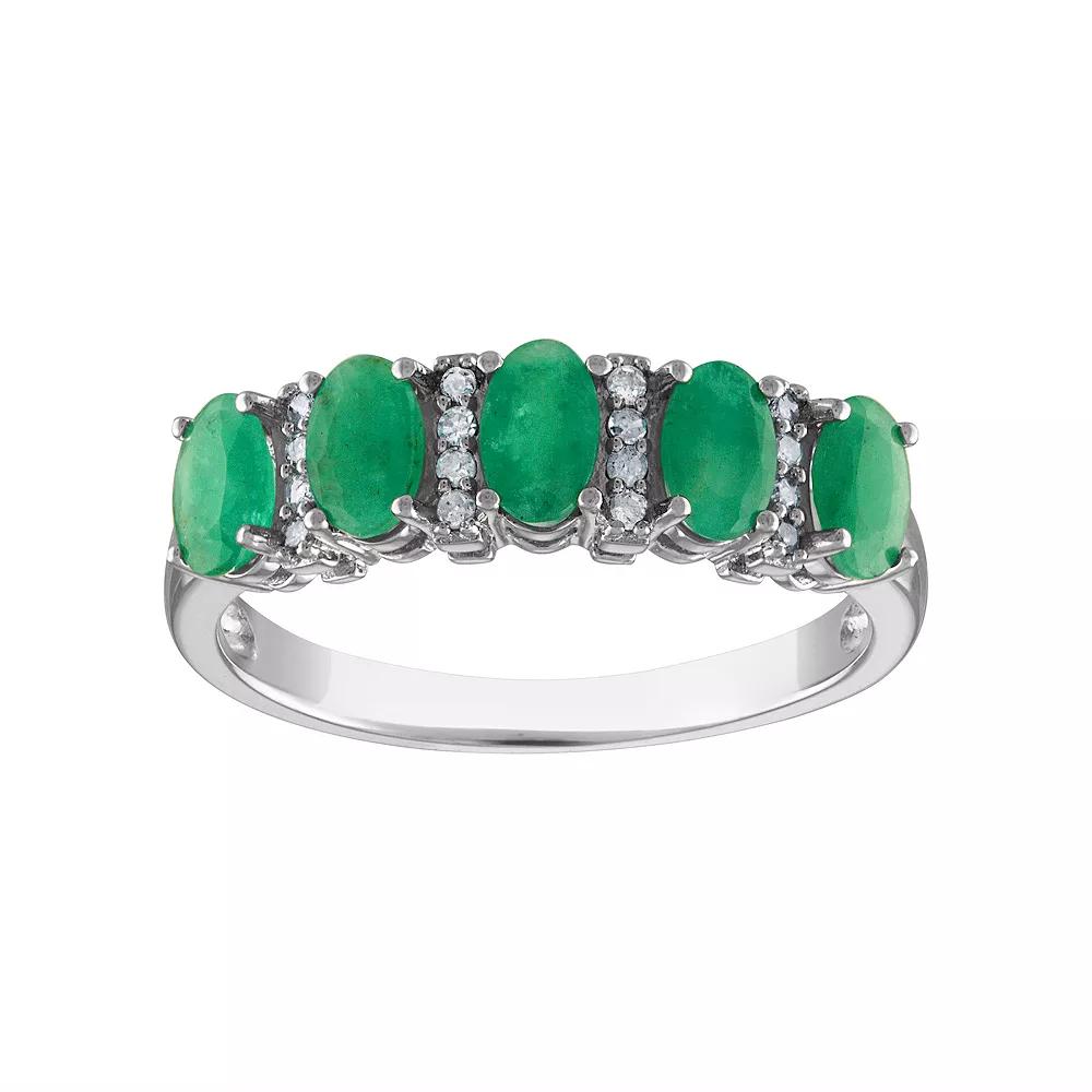 Youll captivate time and again whenever you wear this Tiara emerald and diamond five-stone ring. Youll captivate time and again whenever you wear this Tiara emerald and diamond five-stone ring. Nickel free Metal: sterling silver Packaging: boxed Plating: rhodium Width: 18.5 mm Finish: polishedSTONE DETAILS Stone type: emerald Total weight: 1 3/8 ct. Center stone weight: 1 1/4 ct. Stone size: 5 mm x 3 mm Shape: oval Setting: prongDIAMOND DETAILS Total weight: less than 1/10 ct. Shape: round Setting: prong Gemstones may have been treated to enhance their appearance. Special care may be required. Please visit our Gemstone Treatment & Special Care Guide for more information. Image(s) may be enlarged to show detail. Please note, due to the high value of this item, a signature may be required upon delivery. Size: 7. Color: White. Gender: female. Age Group: adult.