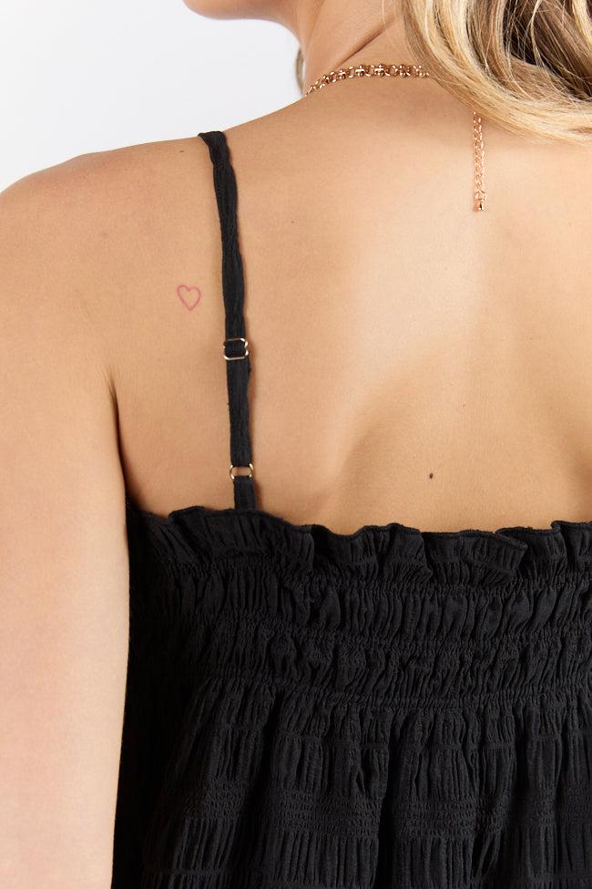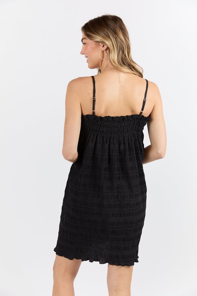 Details Black textured shift romper dress Fabric has stretch, flowy fit Adjustable straps, smocked body, textured fabric Lined with shorts Size small from shoulder to hem: 30" Material and Care 100% polyester Hand wash cold, no drum drying Patterns may vary Materials may have natural variations Colors may vary from different viewing devices.