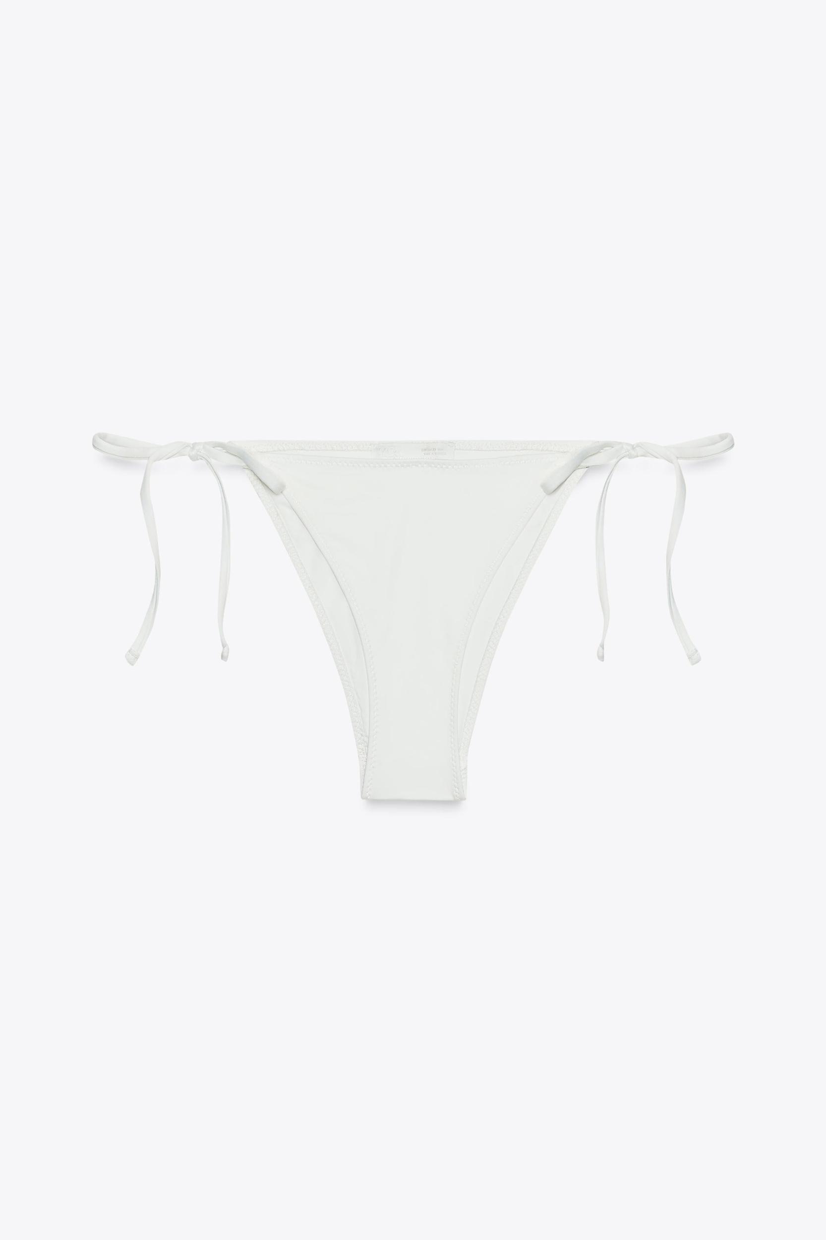 Triangle bikini top with removable cups. Cross-stitch embroidered flower detail. Interior lining. Tie closure at neck and back.